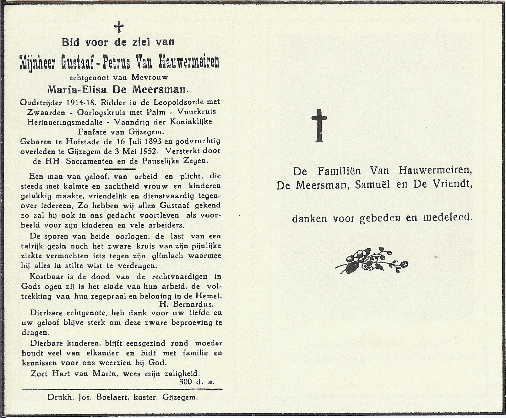 Overlijden van een broer | Petrus Gustaaf Van Hauwermeiren 3 mei 1952 (Leeftijd 52 jaar) |