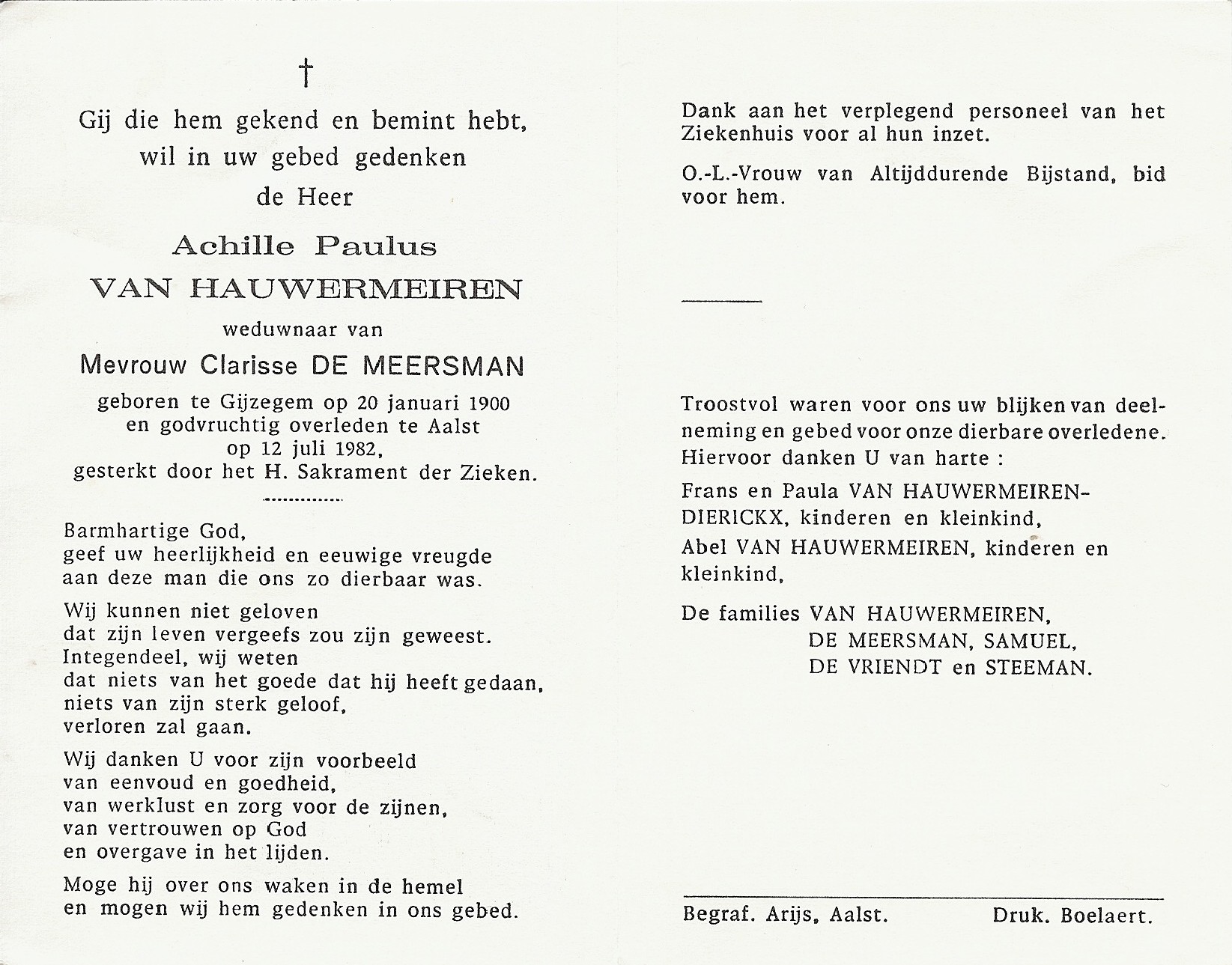 Achilles Paulus Van Hauwermeiren Geboren: 25 januari 1900 29 26 — Gijzegem Overleden: 12 juli 1982 — Aalst |