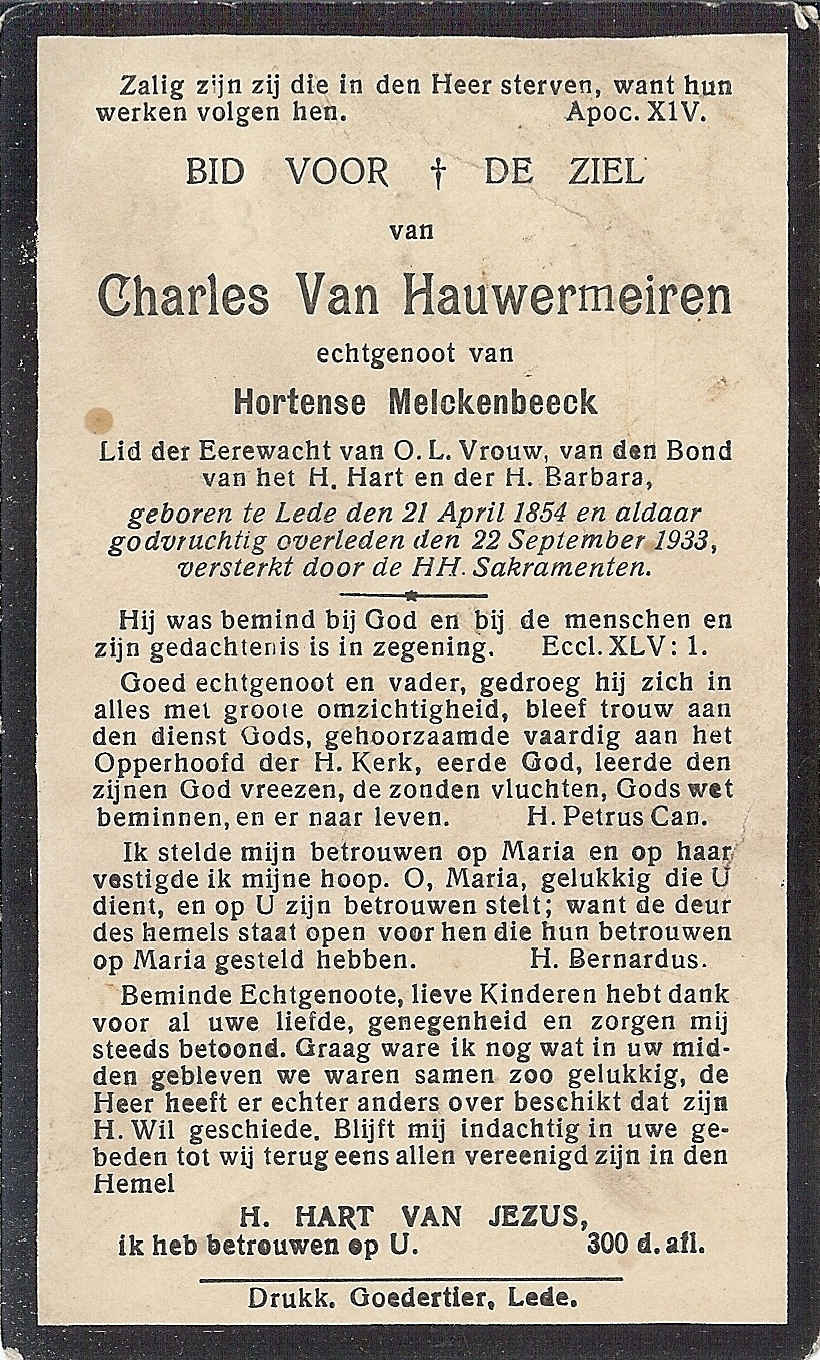 Carolus Ludovicus Van Hauwermeiren Geboren: 21 april 1854 31 24 — Lede Overleden: 22 september 1933 — Lede |