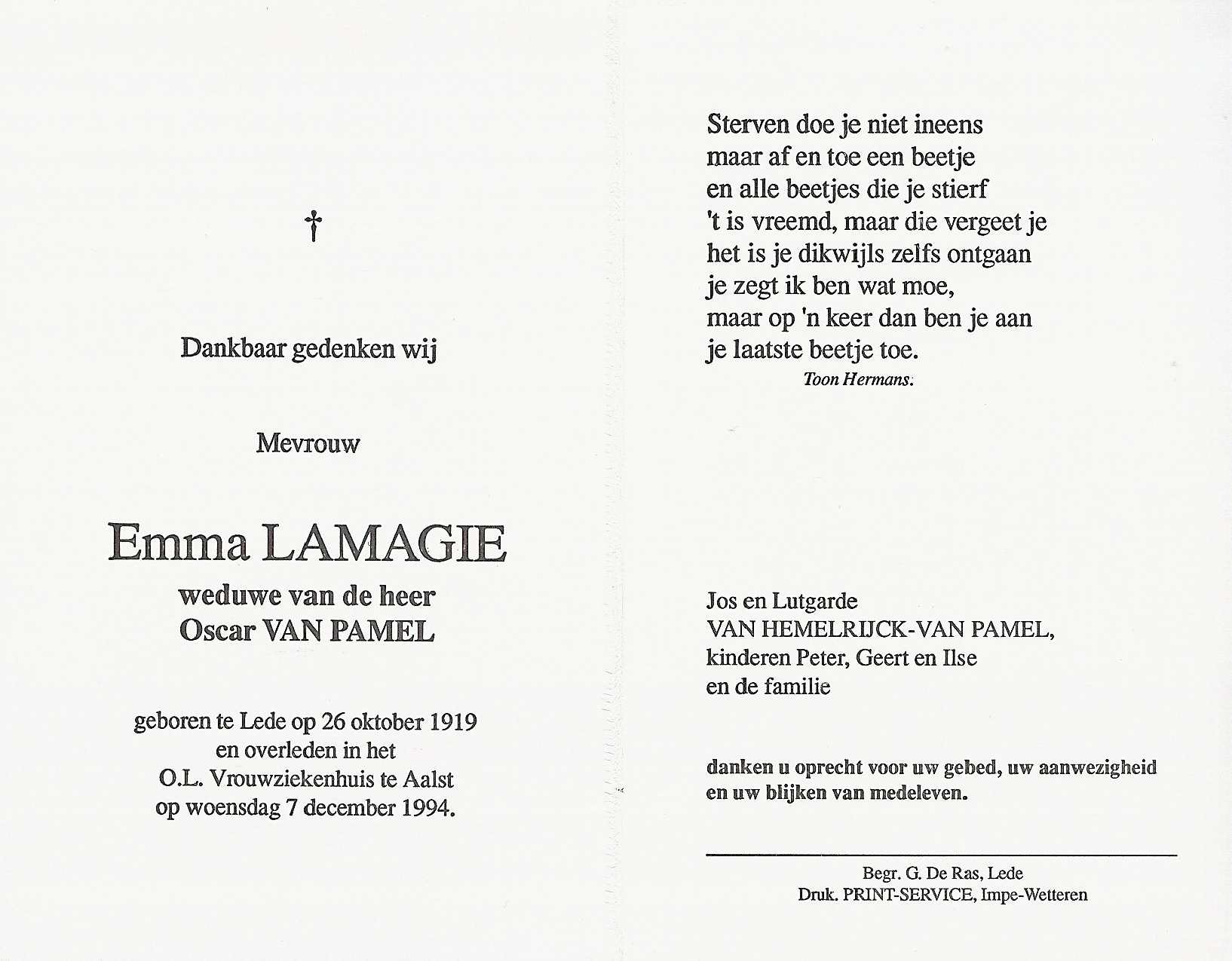 Emma Lamagie Geboren: 26 oktober 1919 — Lede Overleden: 7 december 1994 — Aalst |