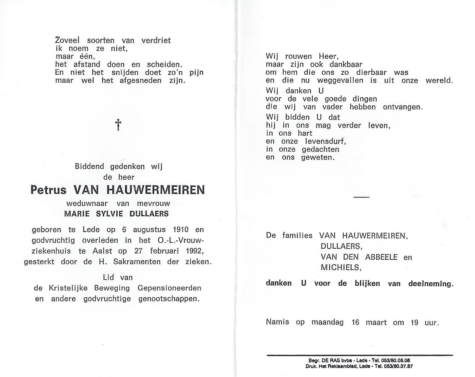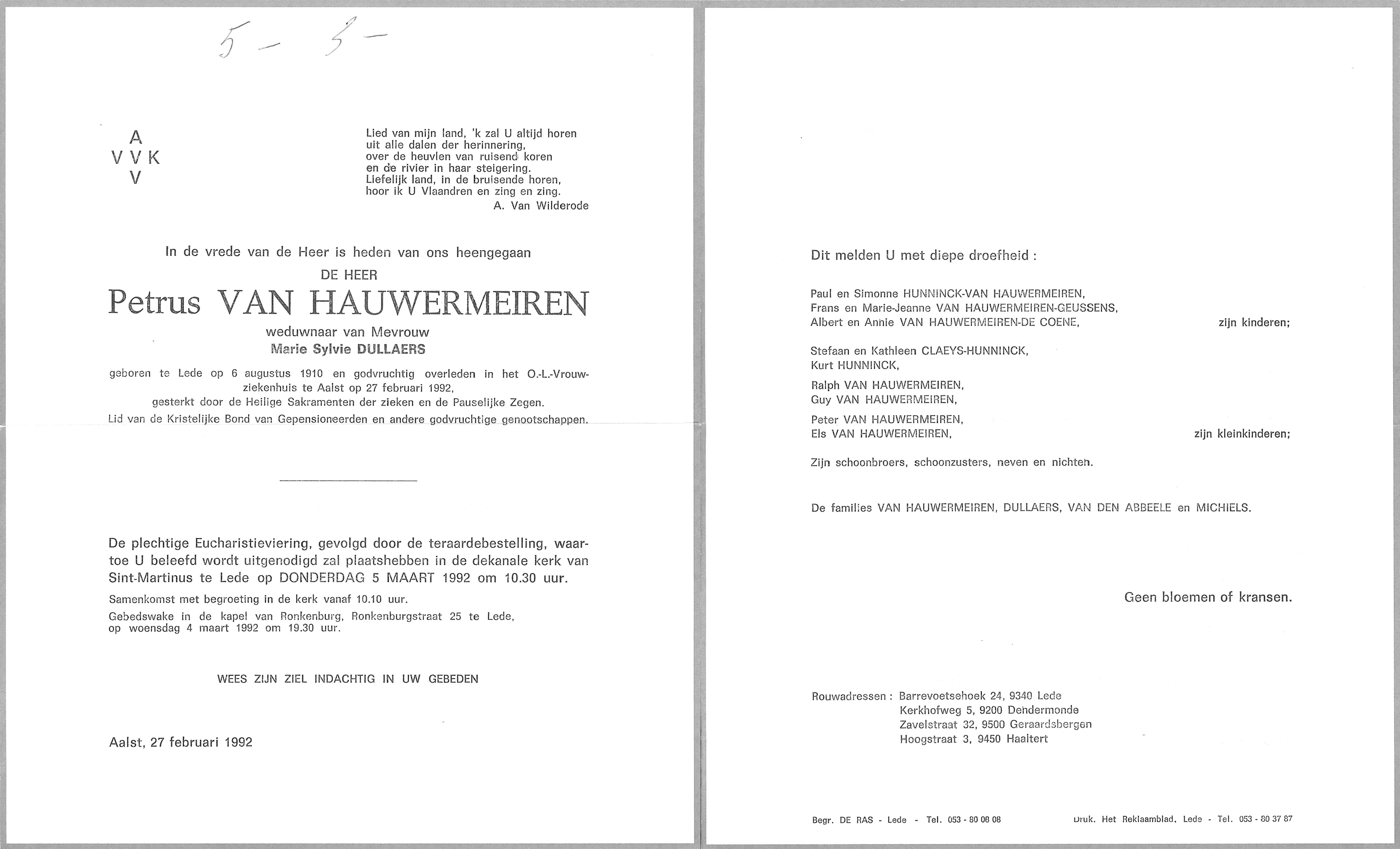 Petrus Albrecht Van Hauwermeiren Geboren: 6 augustus 1910 31 27 — Lede Overleden: 27 februari 1992 — Aalst |