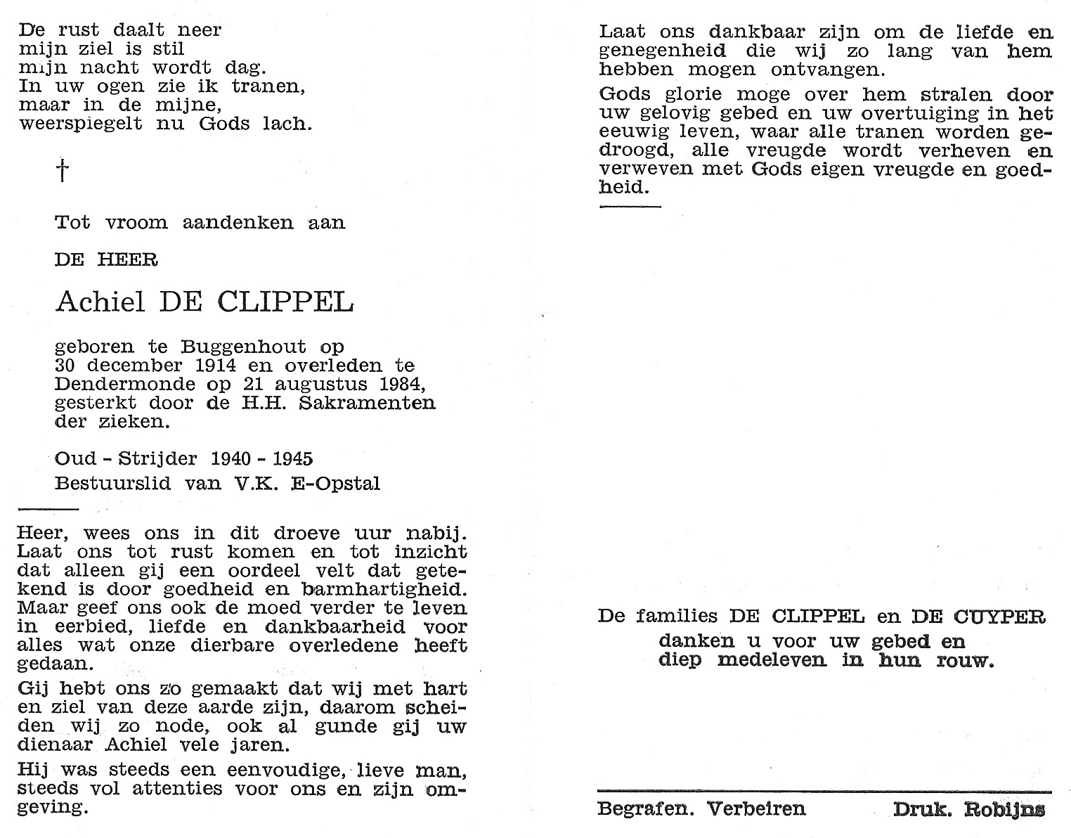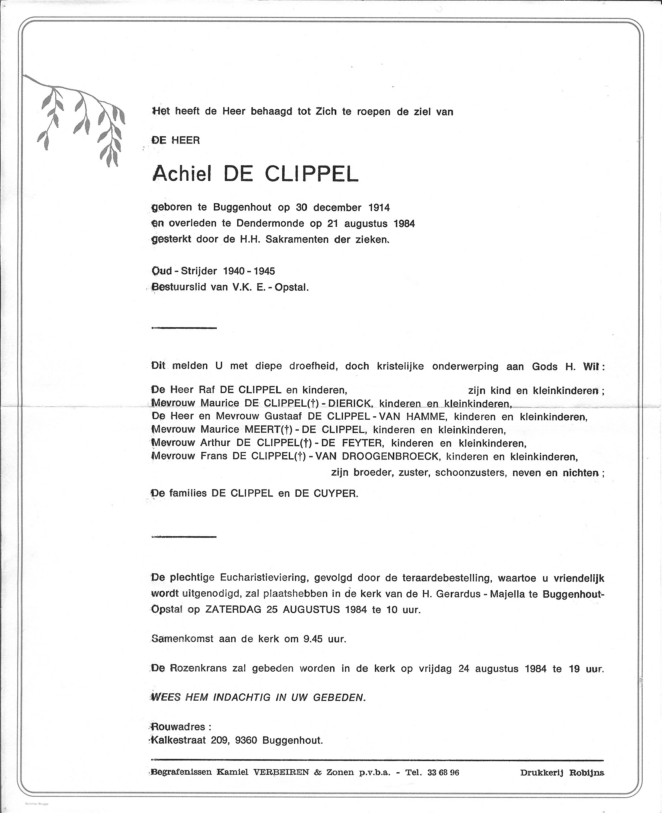 Achiel De Clippel Geboren: 30 december 1914 39 — Buggenhout Overleden: 21 augustus 1984 — Dendermonde |
