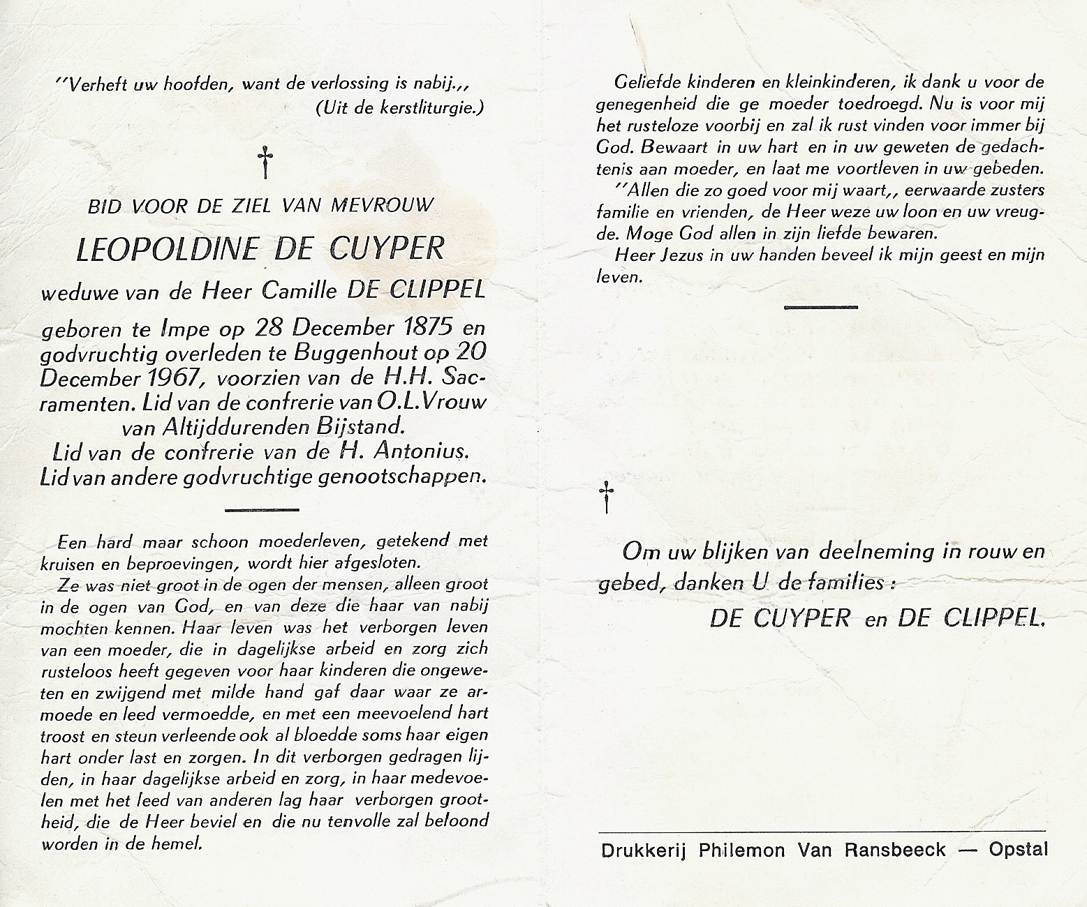 Overlijden van moeder | Leopoldine De Cuyper 20 december 1967 |