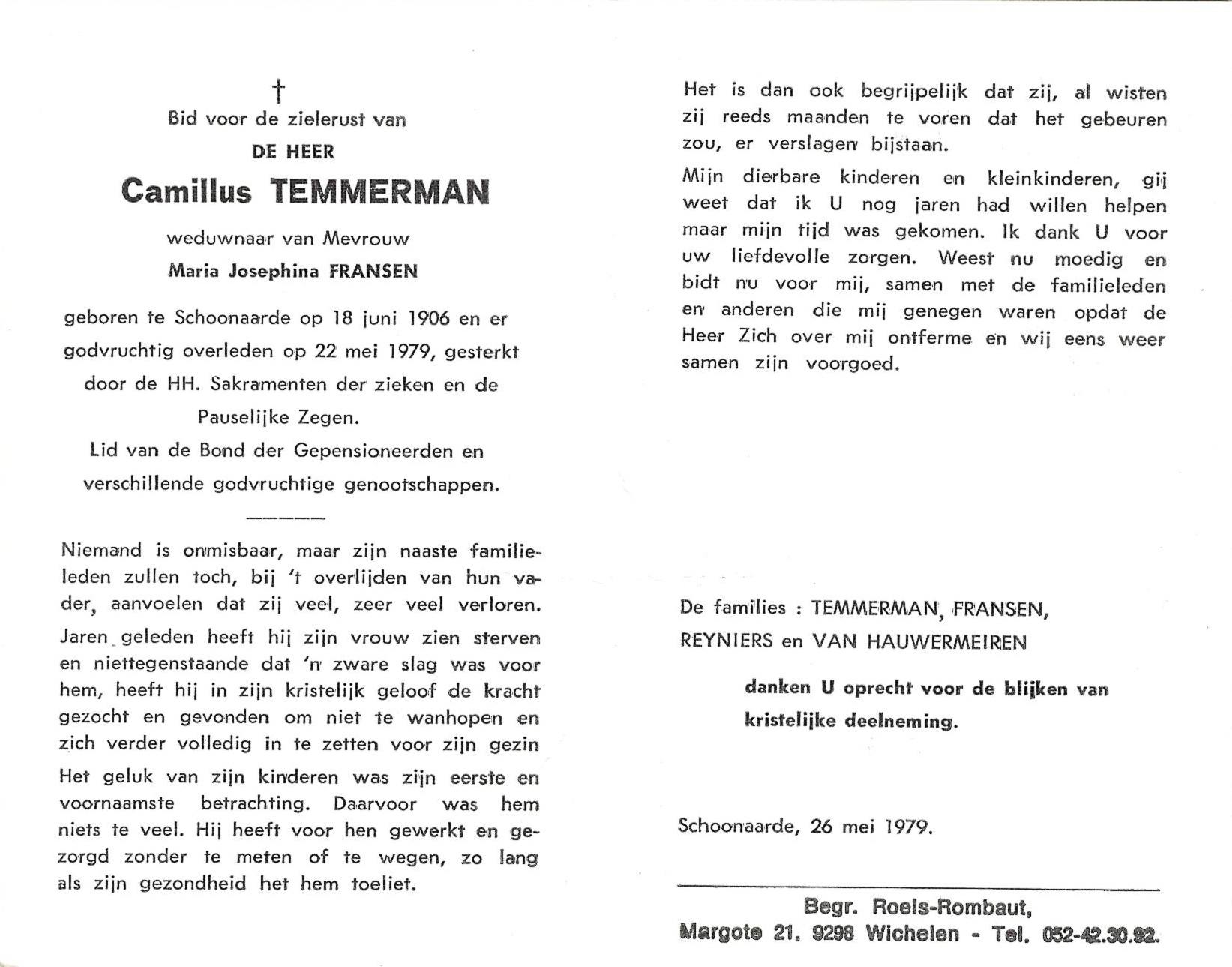 Camillus Temmerman Geboren: 18 juni 1906 — Schoonaarde Overleden: 22 mei 1979 — Schoonaarde |
