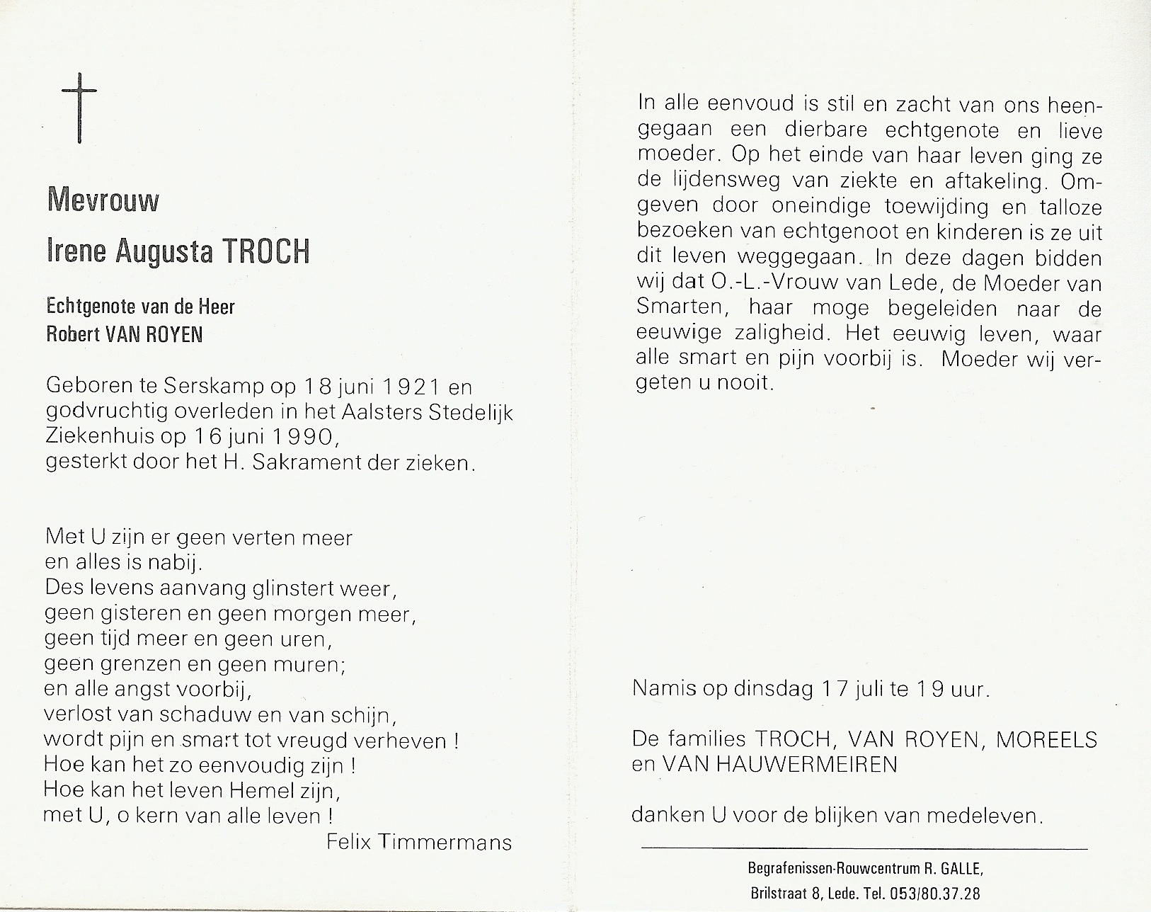 Irene Augusta Troch Geboren: 18 juni 1921 — Serskamp Overleden: 16 juni 1990 — Aalst |