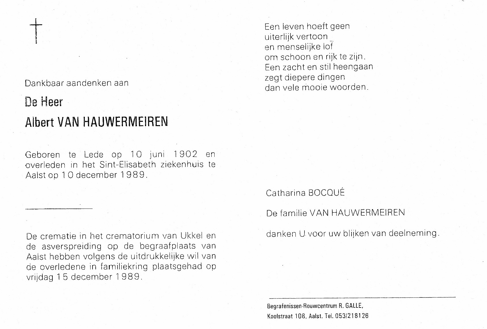 Joannes Albertus Van Hauwermeiren Geboren: 10 juni 1902 44 43 — Lede Overleden: 10 december 1989 — Aalst |