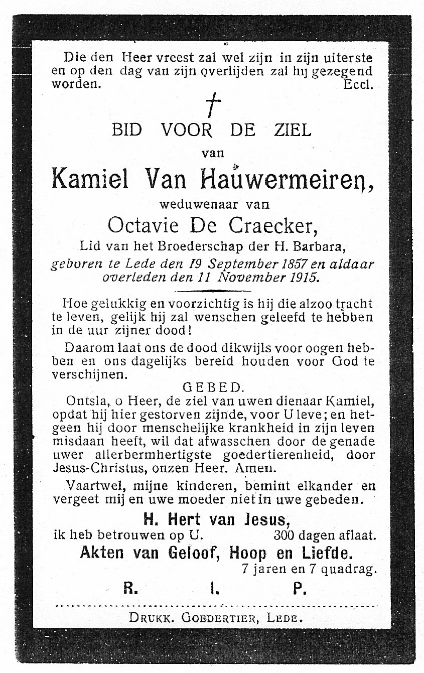 Camilius Van Hauwermeiren Geboren: 19 september 1857 29 28 — Lede Overleden: 11 november 1915 — Lede |
