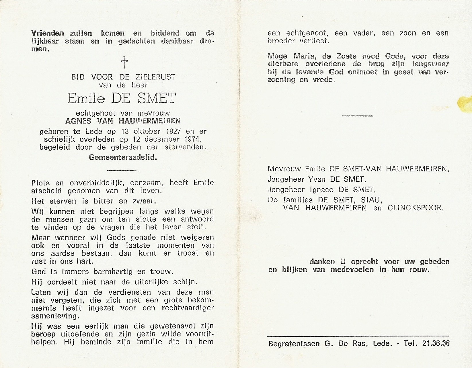Emile De Smet Geboren: 13 oktober 1927 — Lede Overleden: 12 december 1974 — Lede |