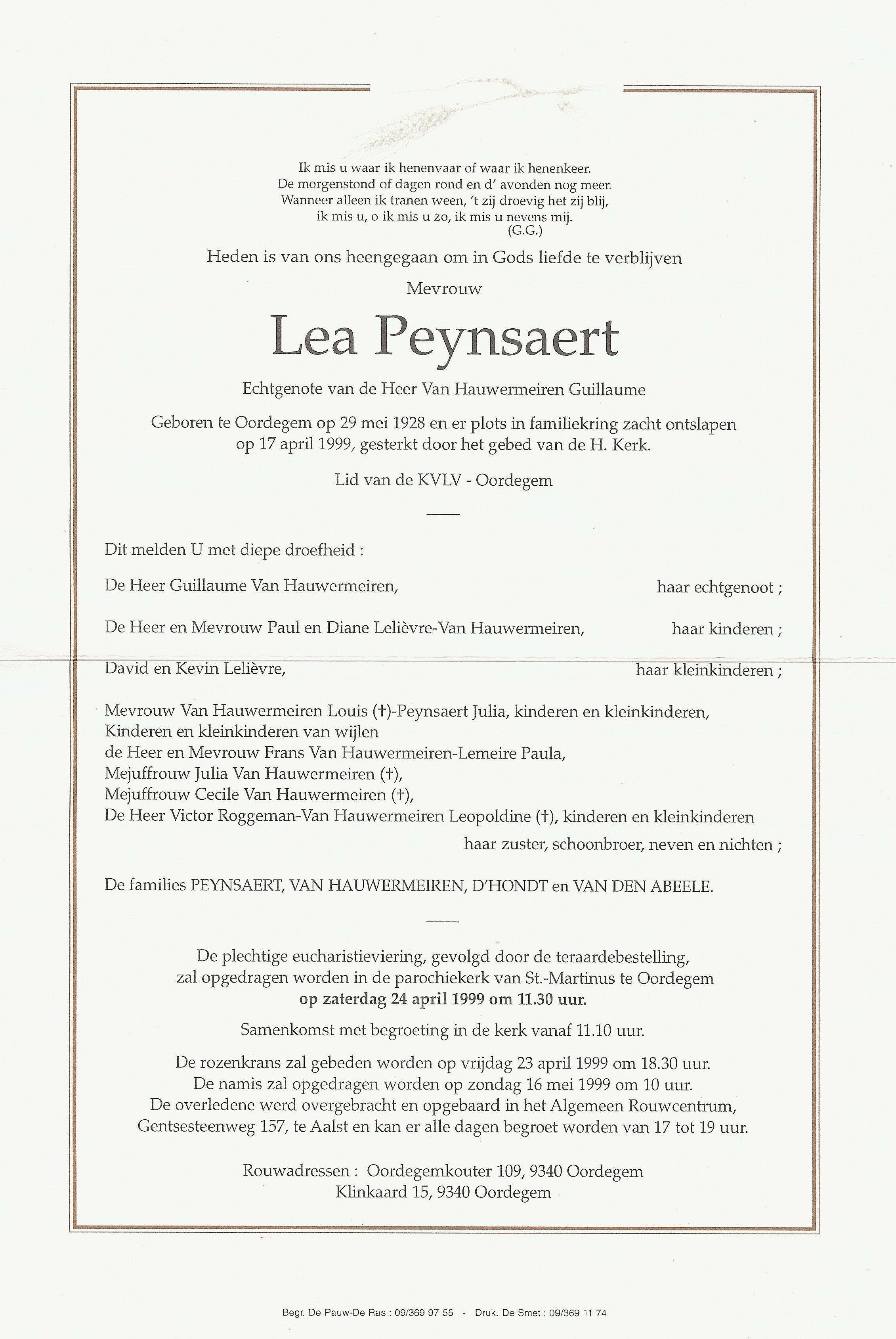 Begrafenis van een echtgenote | Lea Henrica Peynsaert 24 april 1999 (Leeftijd 75 jaar) |