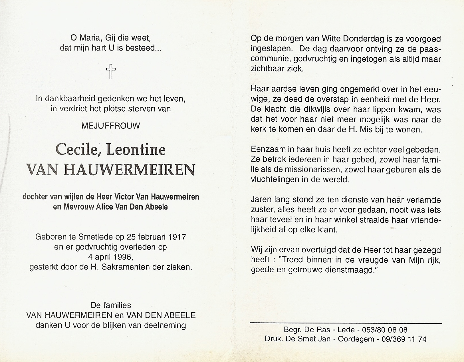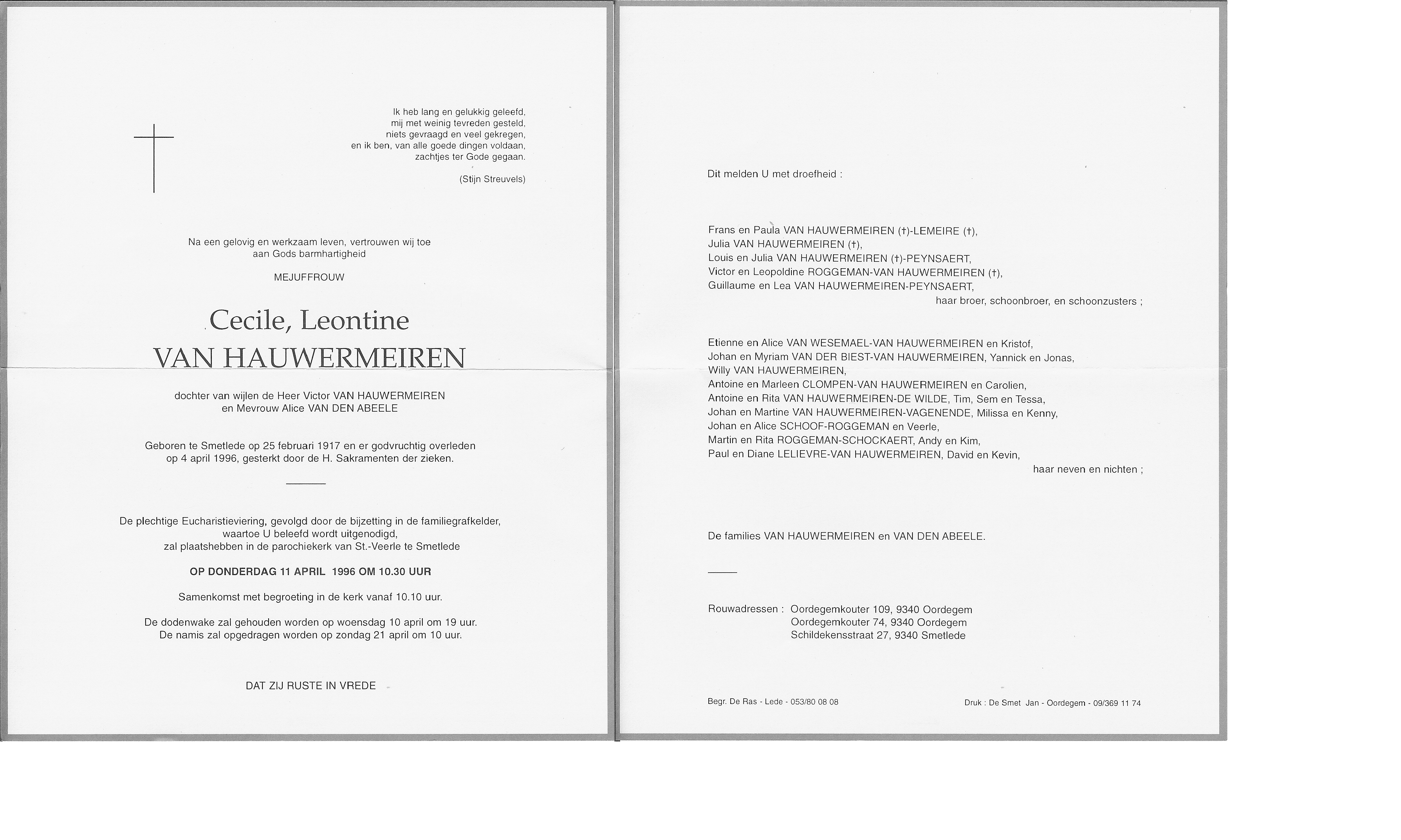 Begrafenis van een zus | Cecile Leontine Van Hauwermeiren 11 april 1996 (Leeftijd 72 jaar) |