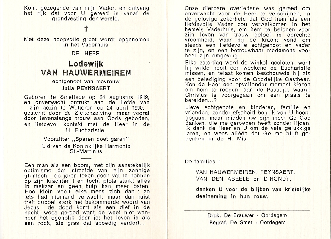 Lodewijk Maria Van Hauwermeiren Geboren: 24 augustus 1919 37 35 — Smetlede Overleden: 24 april 1990 — Wetteren |