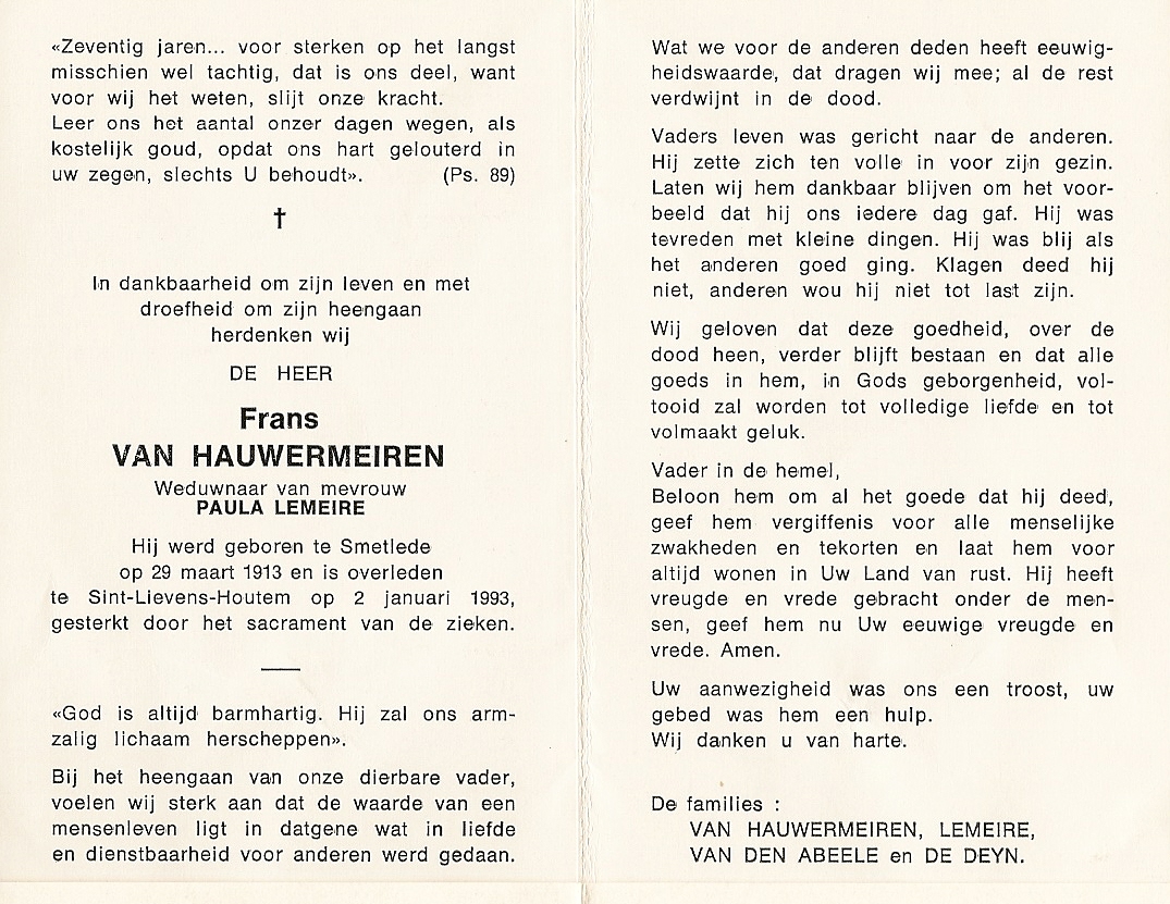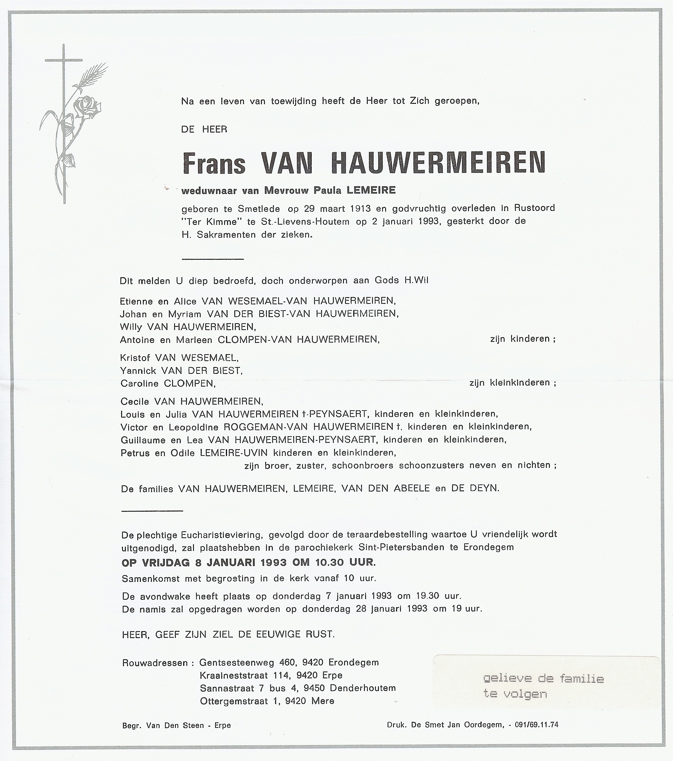Begrafenis van een broer | Frans Van Hauwermeiren 8 januari 1993 (Leeftijd 68 jaar) |