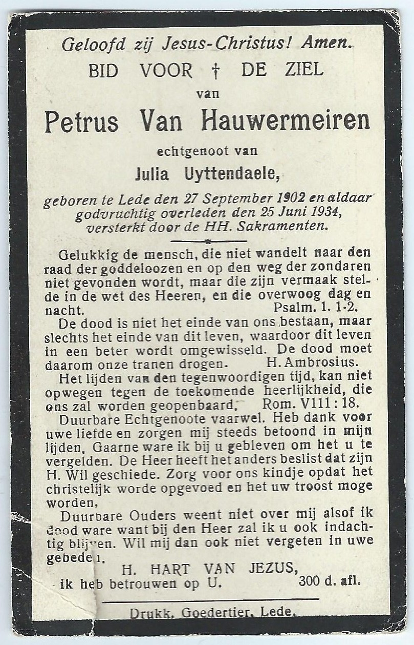 Overlijden van een echtgenoot | Petrus Van Hauwermeiren 25 juni 1934 (Leeftijd 33 jaar) |