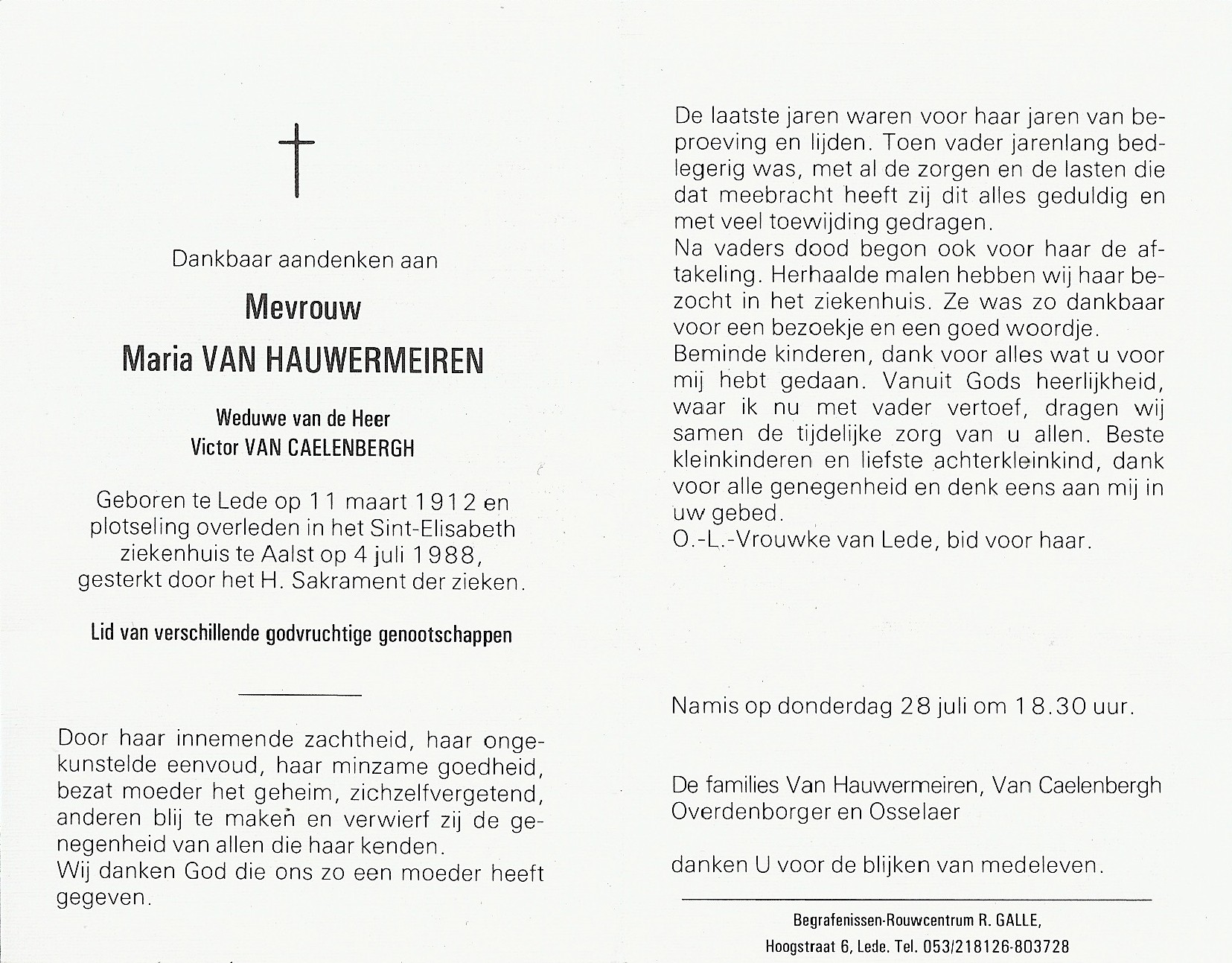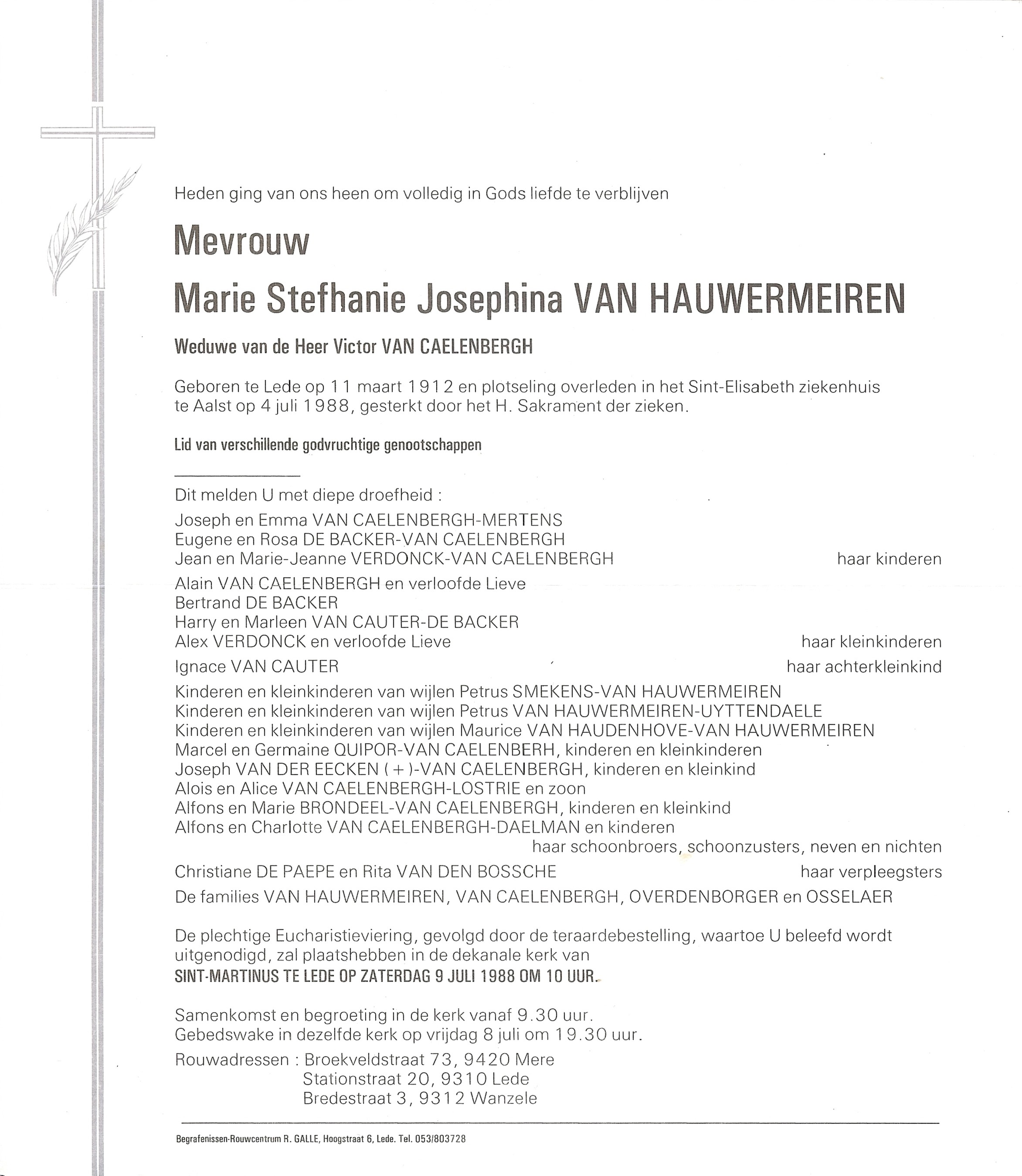 Maria Stephania Josephina Van Hauwermeiren Geboren: 11 maart 1912 53 33 — Lede Overleden: 4 juli 1988 — Aalst |