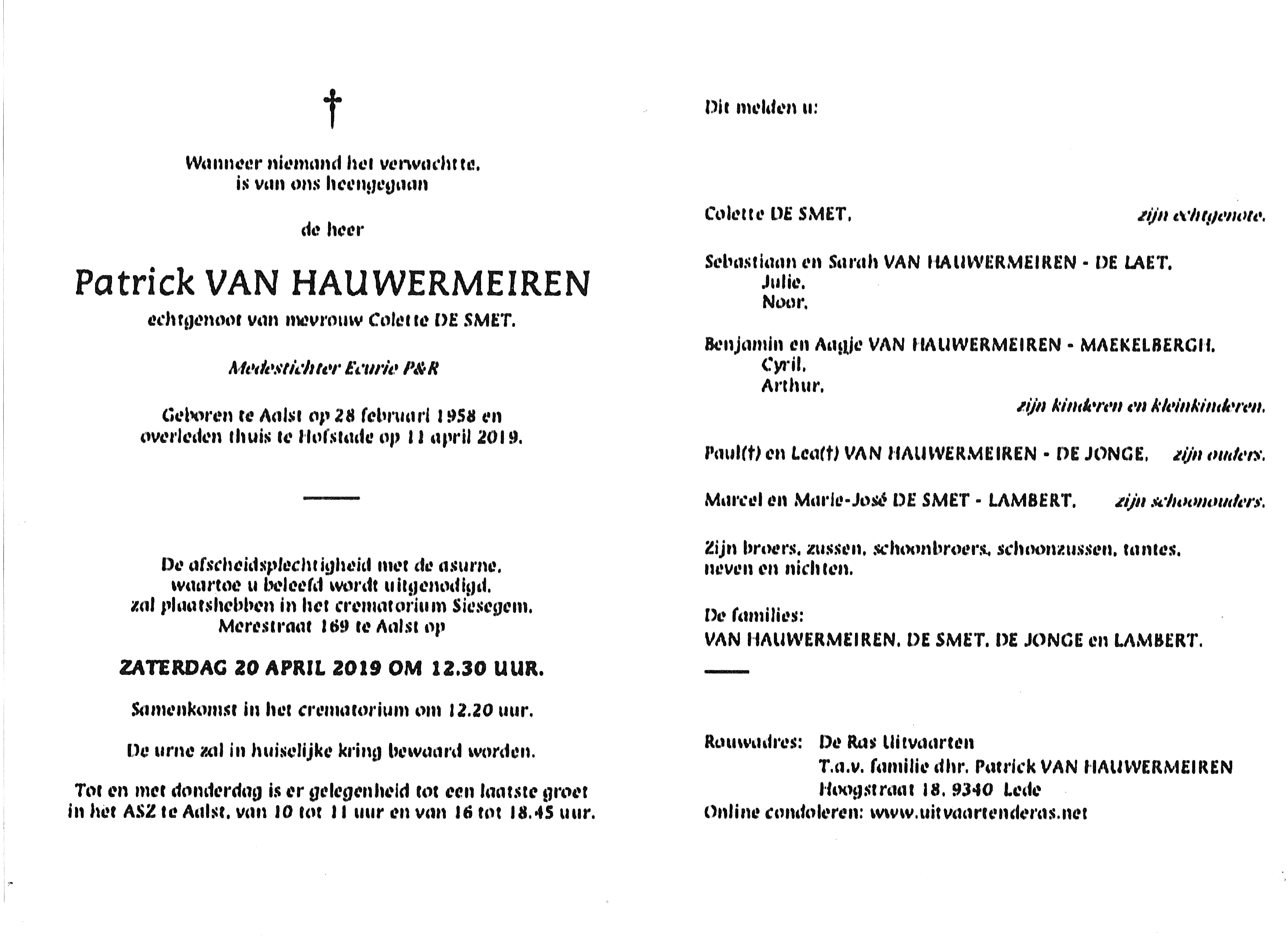 Patrick Van Hauwermeiren Geboren: 28 februari 1958 33 33 — Aalst Overleden: 11 april 2019 — Hofstade |