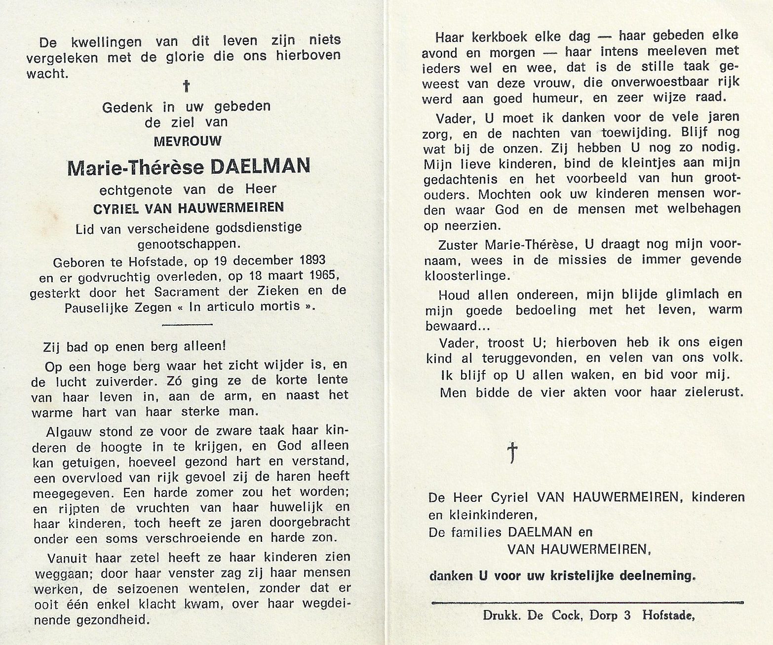 Overlijden van grootmoeder van vaders kant | Marie Therèse Daelman 18 maart 1965 (Leeftijd 13 jaar) |