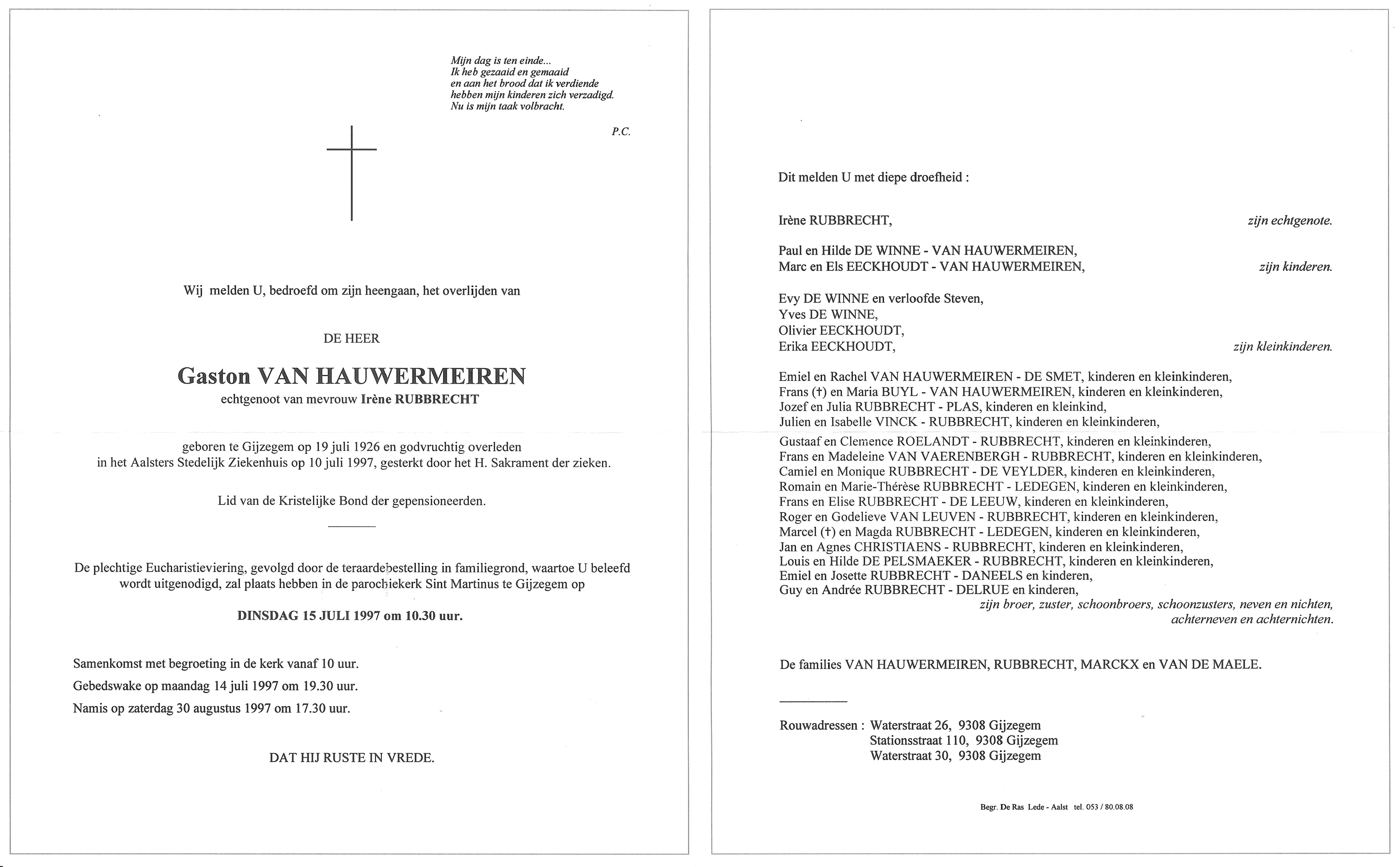 Overlijden van een broer | Gaston Van Hauwermeiren 10 juli 1997 (Leeftijd 69 jaar) |