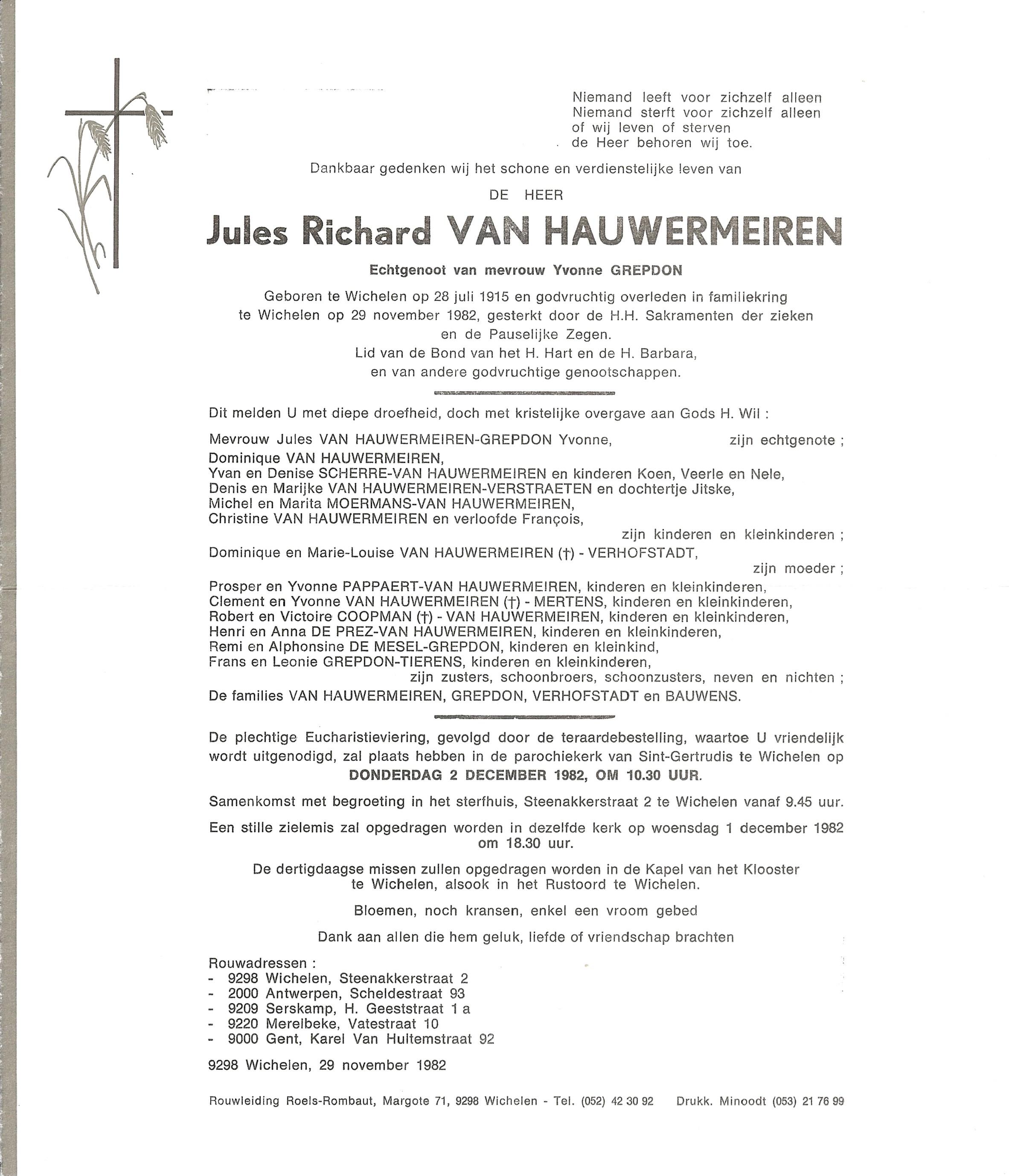 Begrafenis van vader | Jules Richard Van Hauwermeiren 2 december 1982 (Leeftijd 28 jaar) |