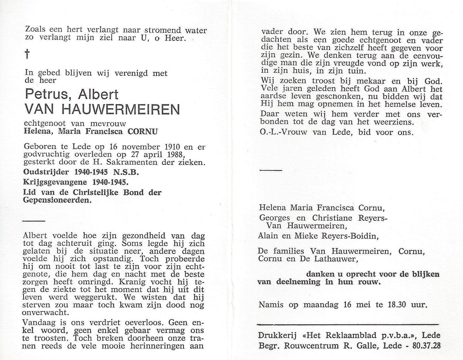 Begrafenis van een broer | Petrus Albertus Van Hauwermeiren 30 april 1988 (Leeftijd 74 jaar) |