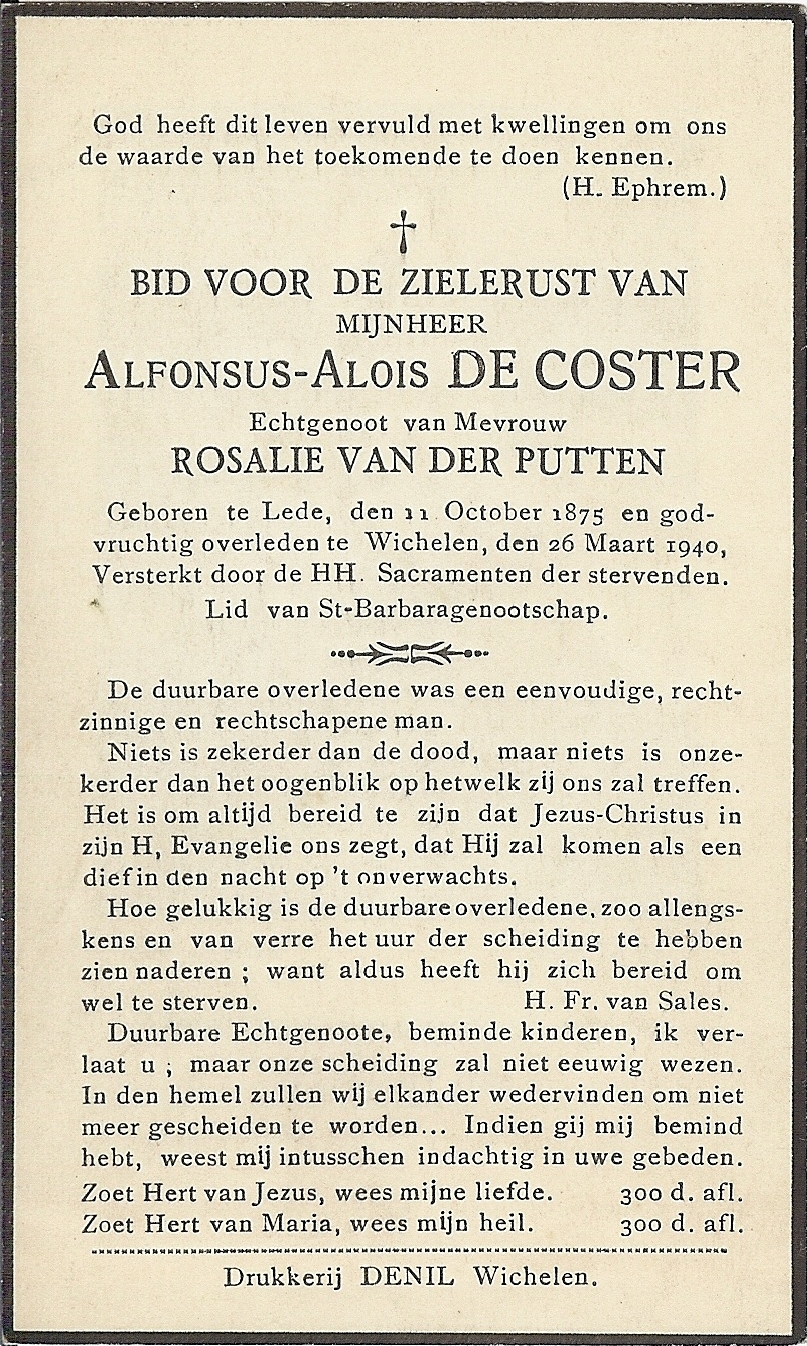 Overlijden van grootvader van moeders kant | Alphonsus-Alois De Coster 26 maart 1940 (Leeftijd 4 jaar) |