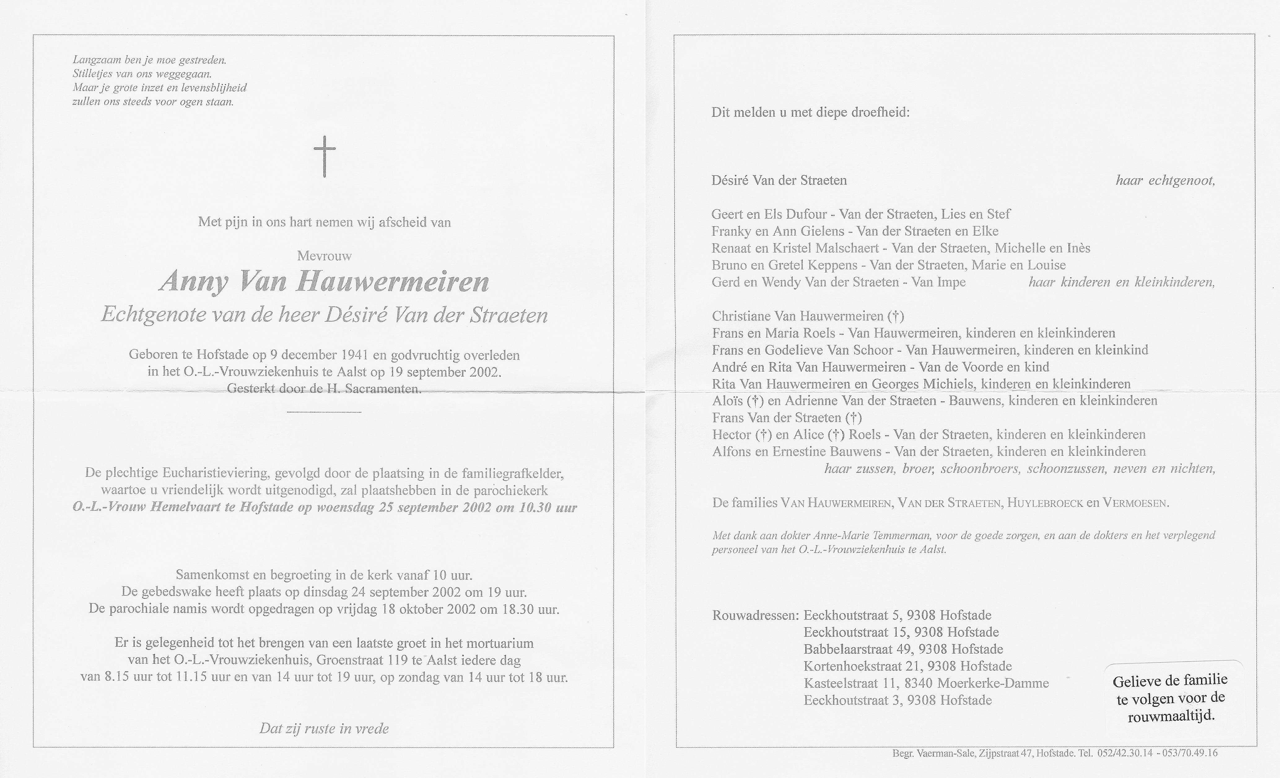 Begrafenis van vader | Omer Marie Van Hauwermeiren 9 juni 1994 (Leeftijd 52 jaar) |