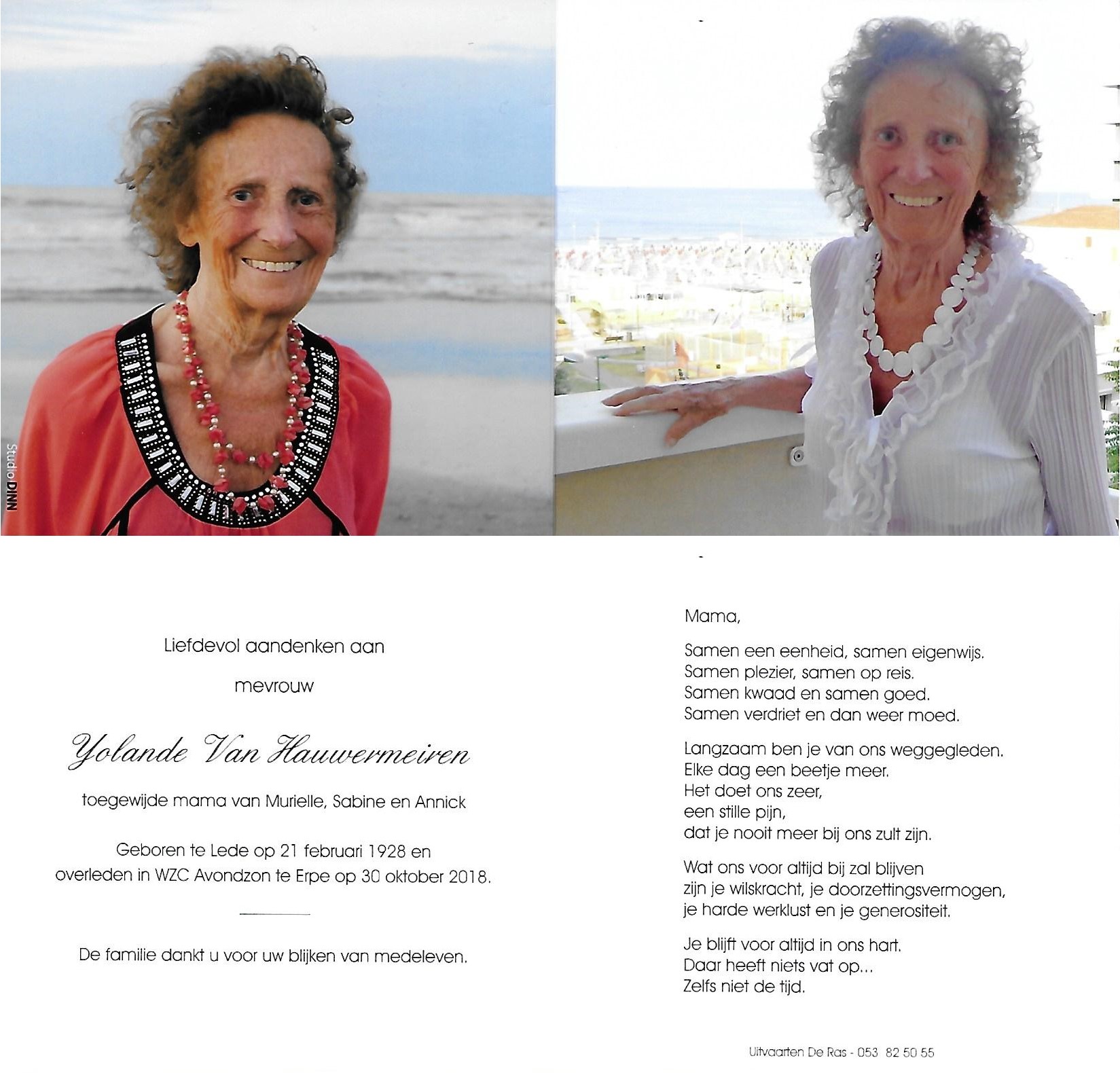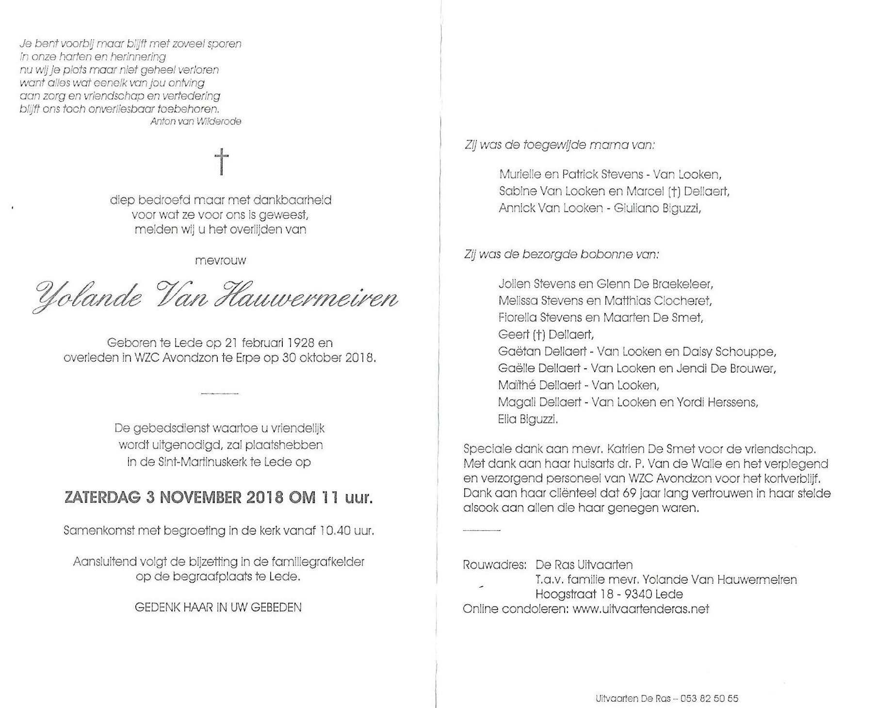 Yolande Emilie Aline Alice Marie Van Hauwermeiren Geboren: 21 februari 1928 29 28 — Lede Overleden: 30 oktober 2018 — Erpe |