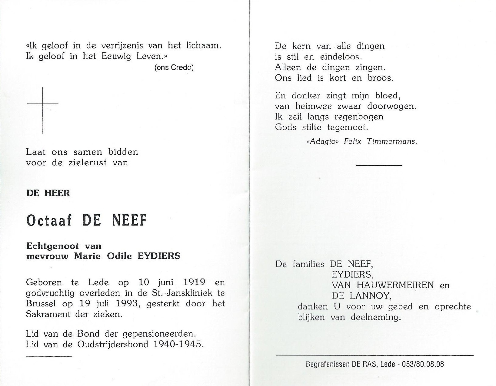 Octaaf De Neef Geboren: 10 juni 1919 31 28 — Lede Overleden: 19 juli 1993 — Brussel |