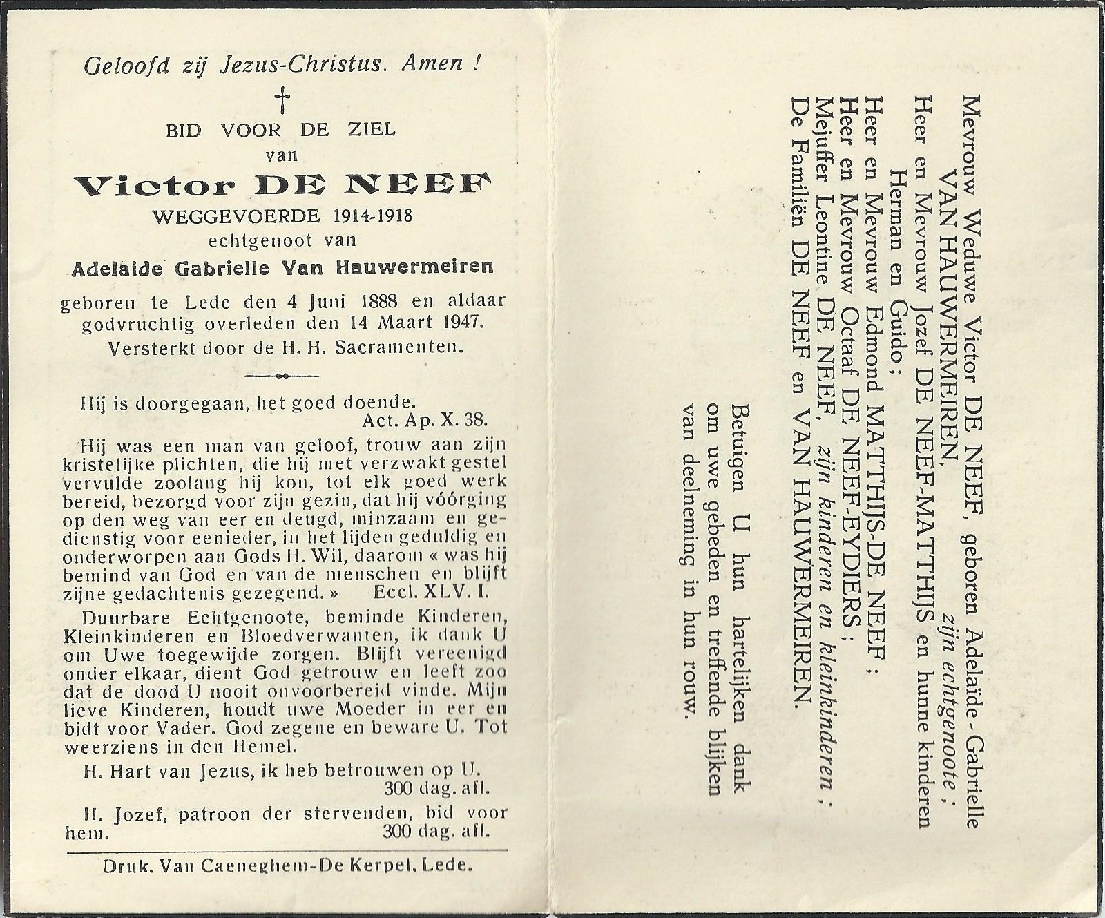 Victor De Neef Geboren: 4 juni 1888 — Lede Overleden: 14 maart 1947 — Lede |