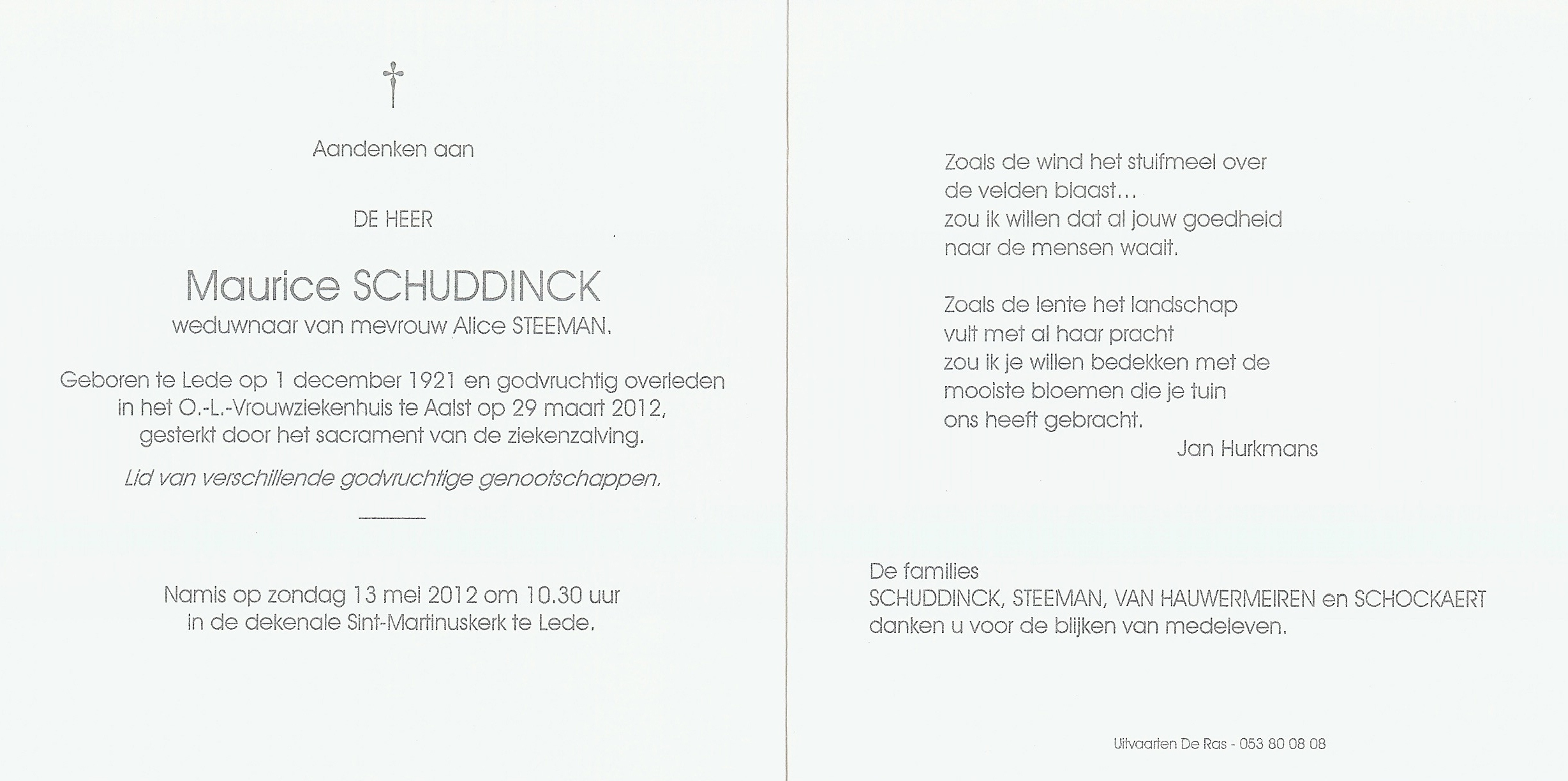 Maurice Schuddinck Geboren: 1 december 1921 40 39 — Lede Overleden: 29 maart 2012 — Aalst |