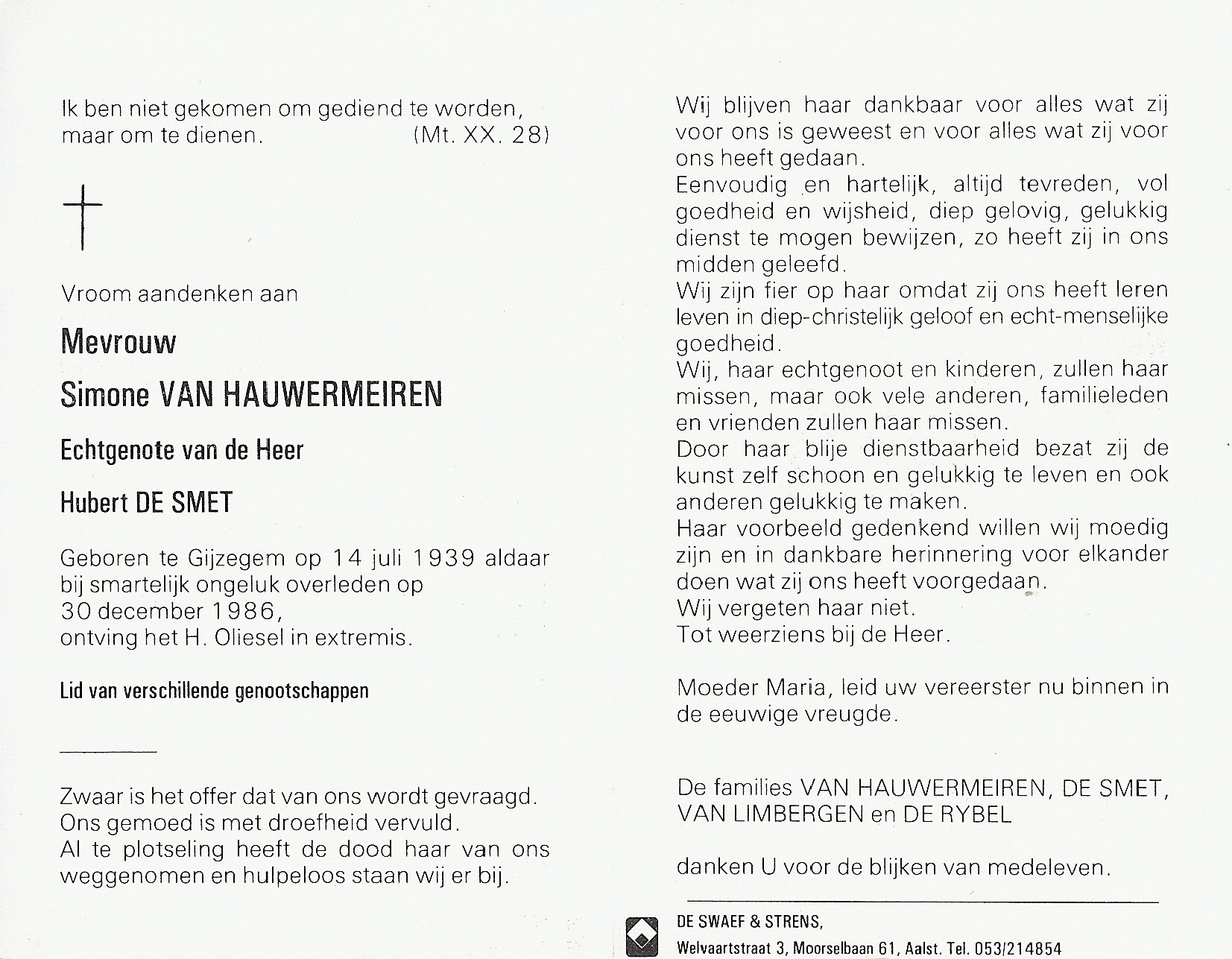 Simone Van Hauwermeiren Geboren: 14 juli 1939 27 27 — Gijzegem Overleden: 30 december 1986 — Gijzegem |