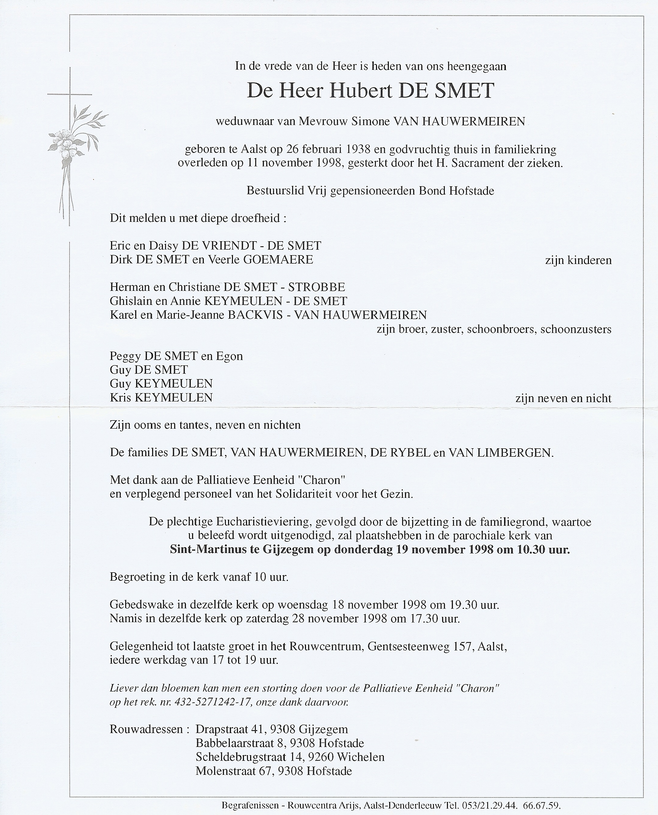 Hubert De Smet Geboren: 26 februari 1938 — Aalst Overleden: 11 november 1998 — Gijzegem |