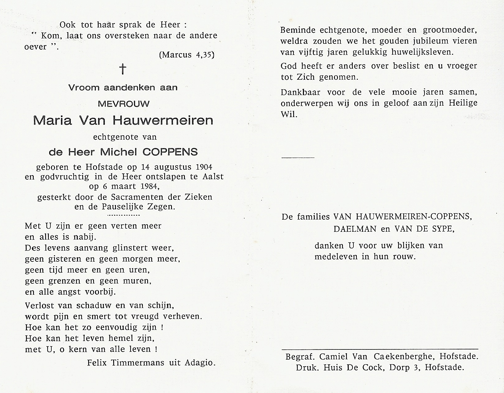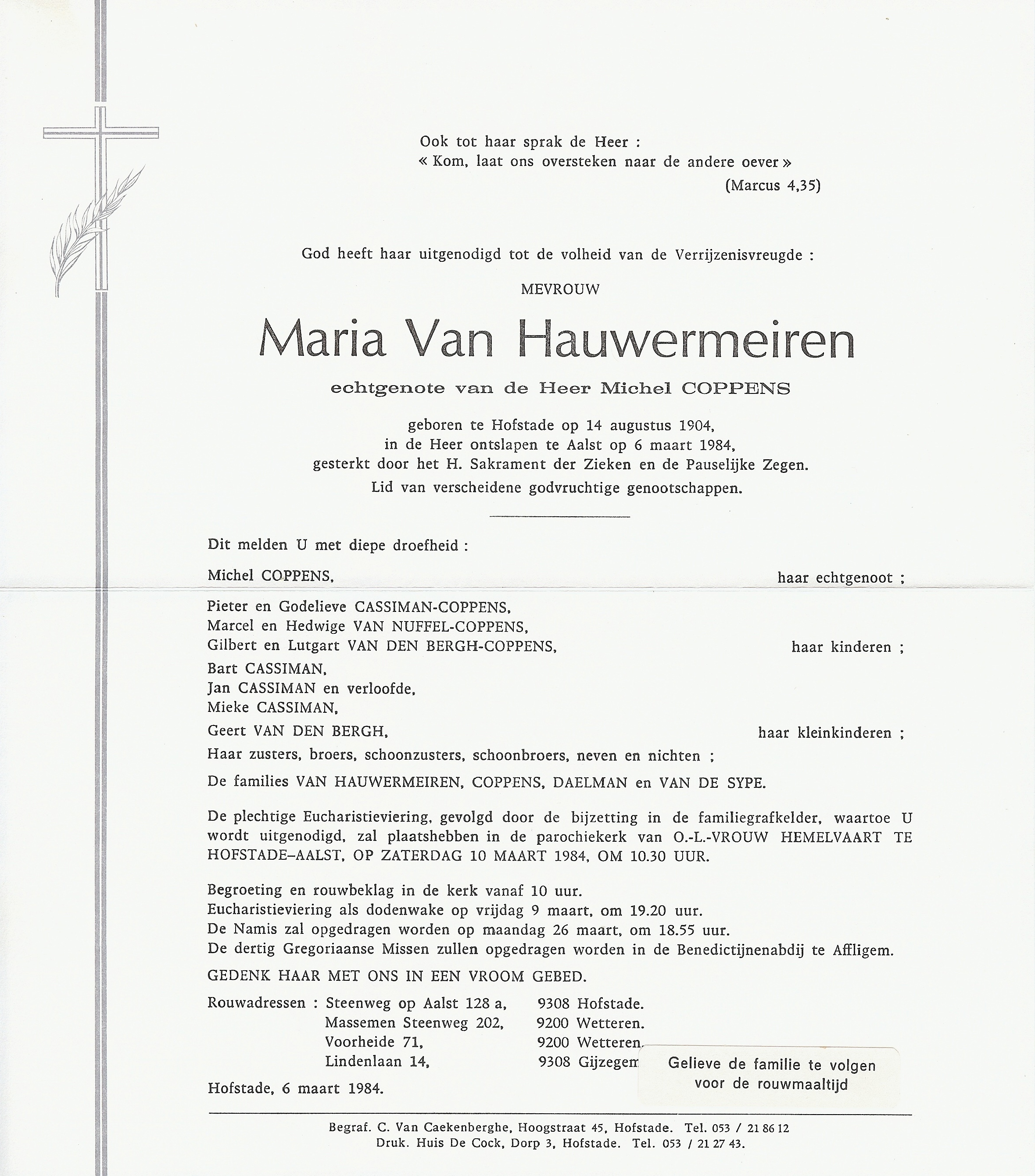 Maria Florentia Van Hauwermeiren Geboren: 14 augustus 1904 26 24 — Hofstade Overleden: 6 maart 1984 — Aalst |