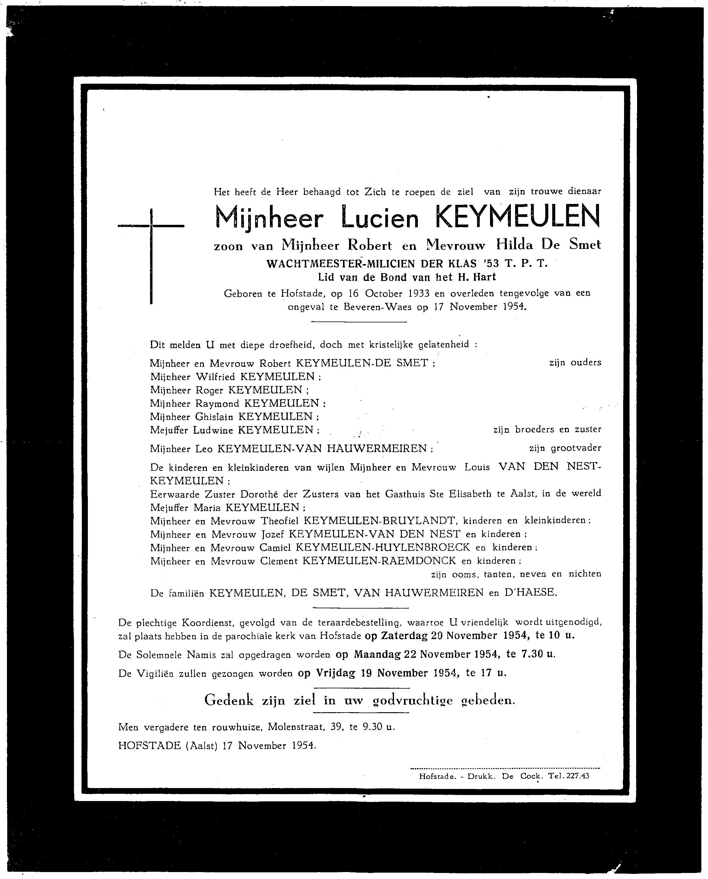 Lucien Keymeulen Geboren: 16 oktober 1933 38 30 — Hofstade Overleden: 17 november 1954 — Beveren |
