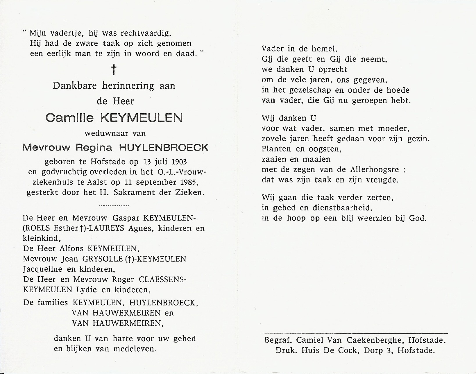 Camille Keymeulen Geboren: 13 juli 1903 34 36 — Hofstade Overleden: 11 september 1985 — Aalst |