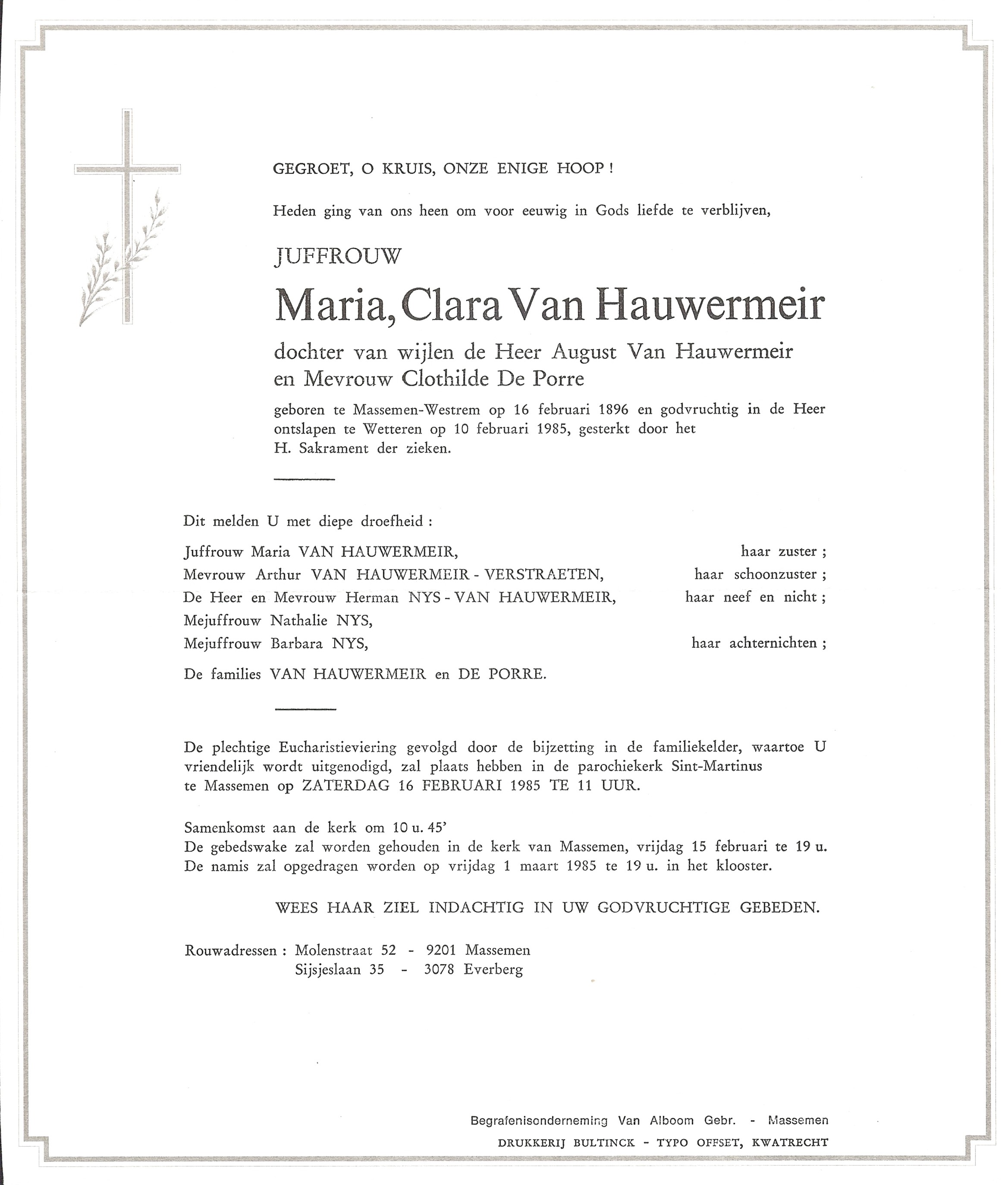 Marie-Clara Van Hauwermeir Geboren: 16 februari 1896 41 40 — Massemen Overleden: 10 februari 1985 — Wetteren |
