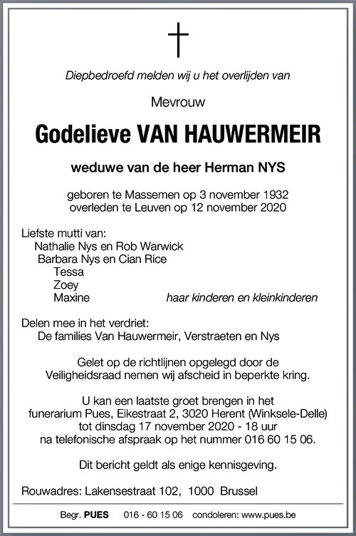 Godelieve Van Hauwermeir Geboren: 3 november 1932 42 — Massemen Overleden: 12 november 2020 — Leuven |