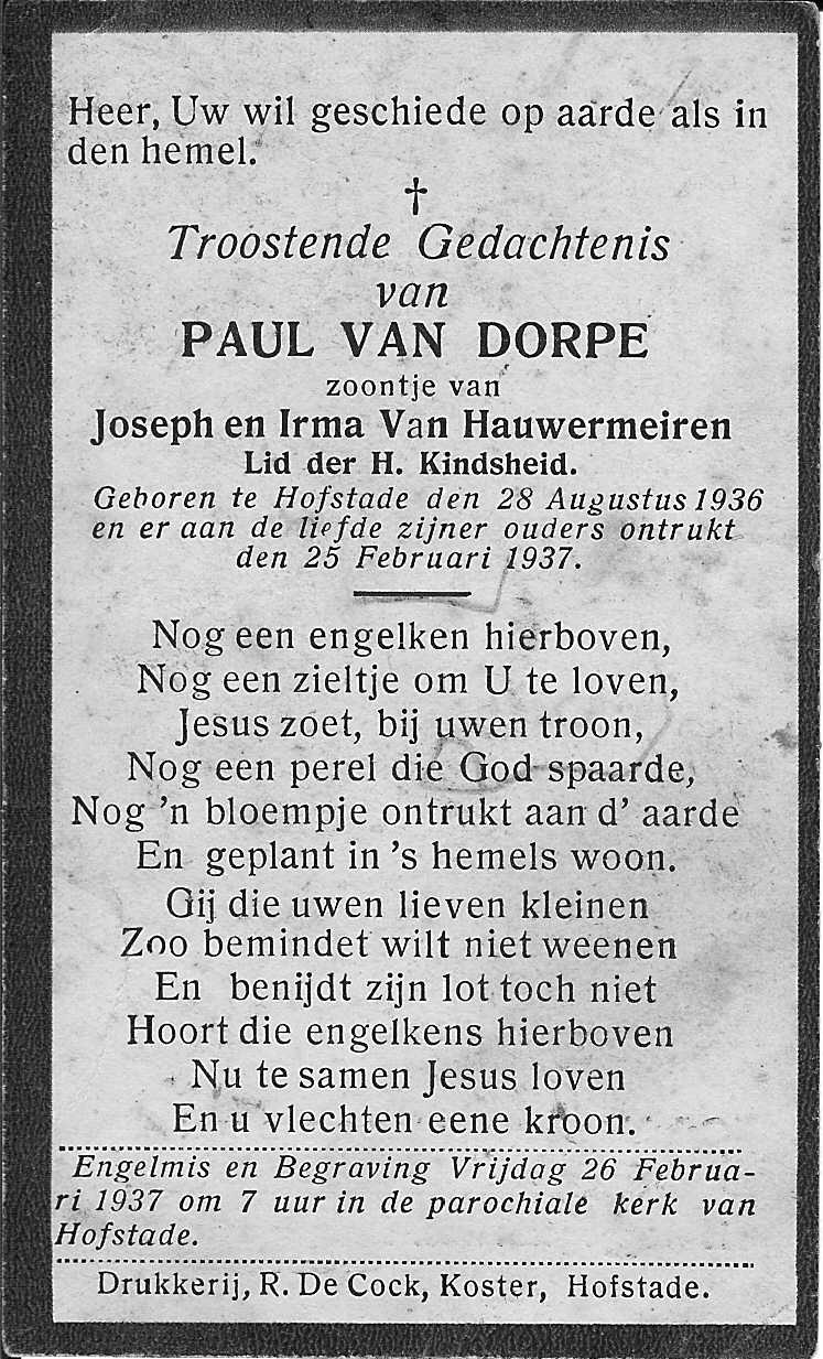Paul Van Dorpe Geboren: 28 augustus 1936 42 37 — Hofstade Overleden: 25 februari 1937 — Hofstade |