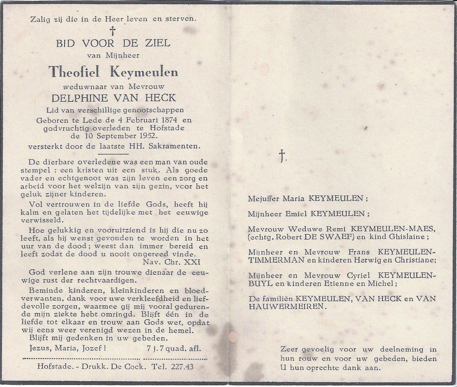 Theofiel Keymeulen Geboren: 4 februari 1874 31 30 — Lede Overleden: 10 september 1952 — Hofstade |