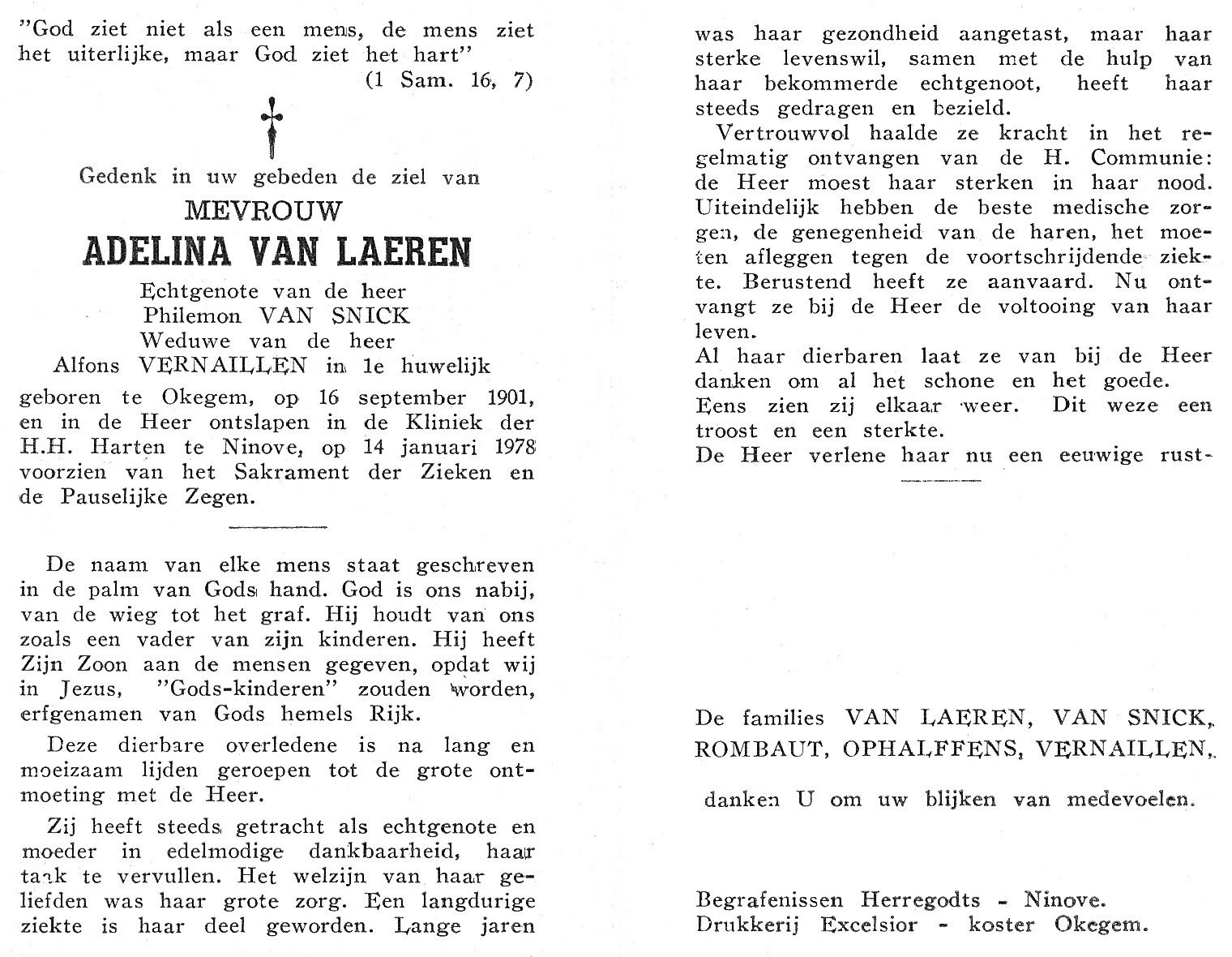 Adelina Van Laeren Geboren: 16 september 1901 41 39 — Okegem Overleden: 14 januari 1978 — Ninove |