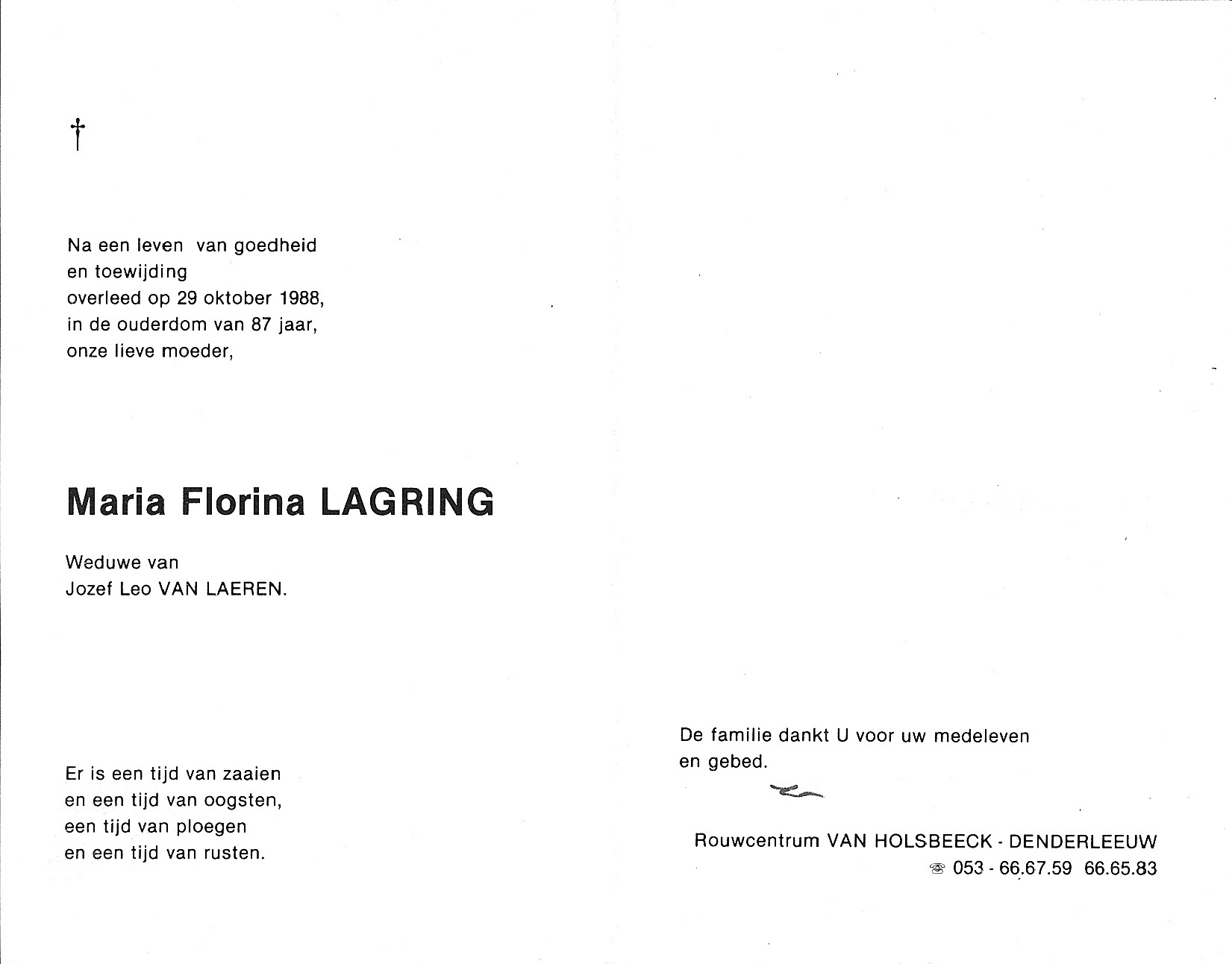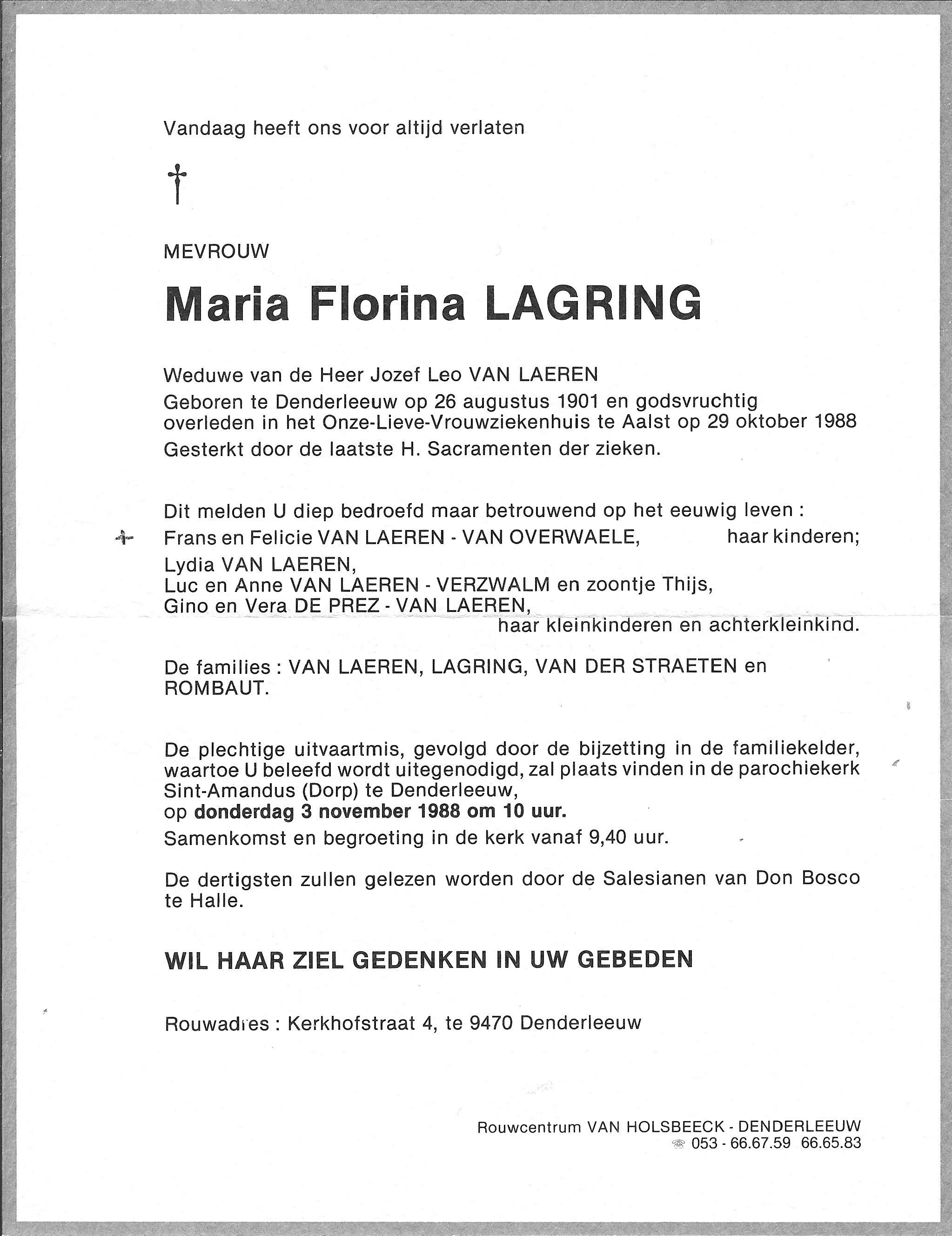 Maria Florina Lagring Geboren: 26 augustus 1901 — Denderleeuw Overleden: 29 oktober 1988 — Aalst |