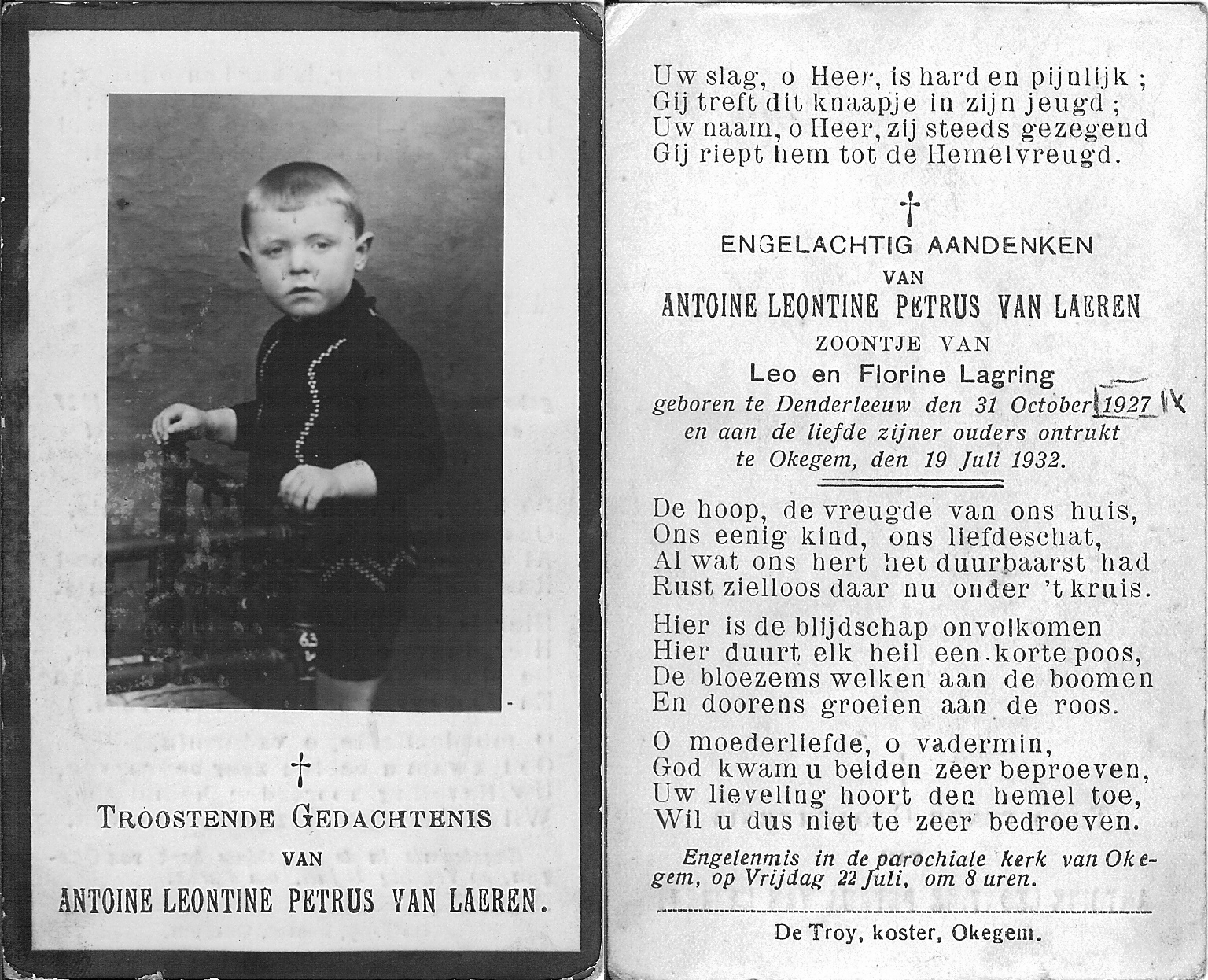 Overlijden van een zoon | Antoine Leontine Petrus Van Laeren 19 juli 1932 (Leeftijd 30 jaar) |