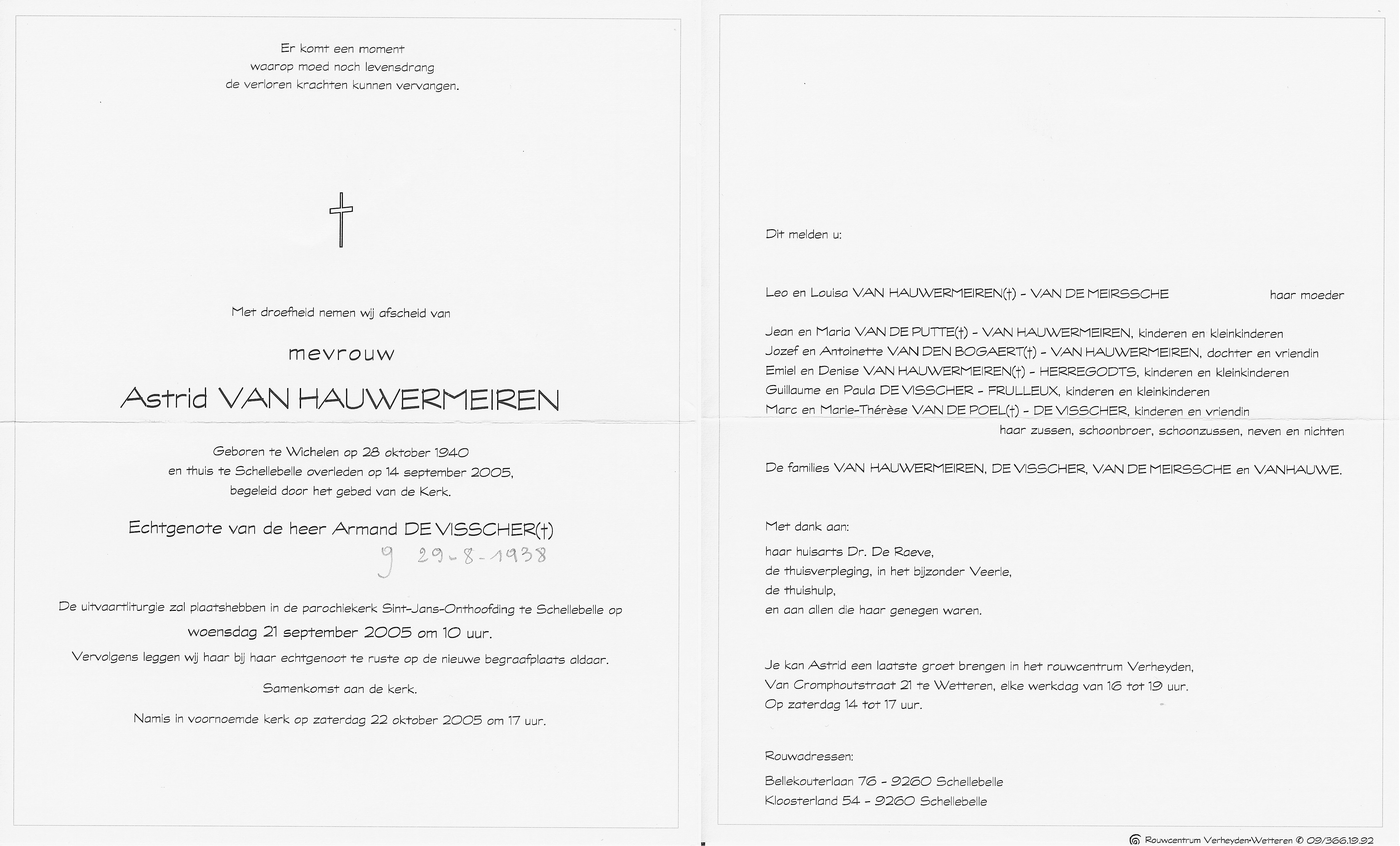 Overlijden van een dochter | Astrid Elisabeth Van Hauwermeiren 14 september 2005 (Leeftijd 92 jaar) |