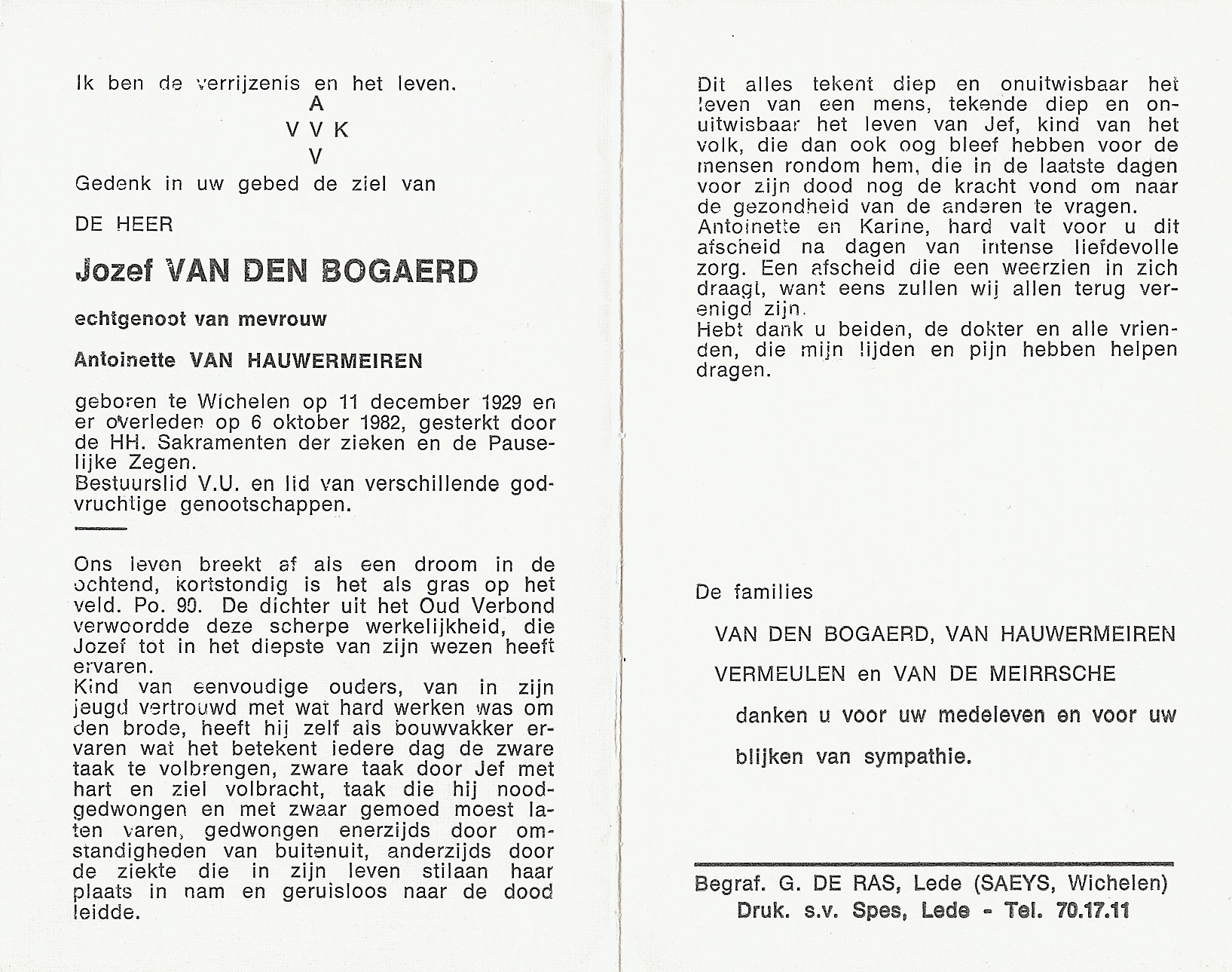 Jozef Van den Bogaerd Geboren: 11 december 1929 — Wichelen Overleden: 6 november 1982 — Wichelen |
