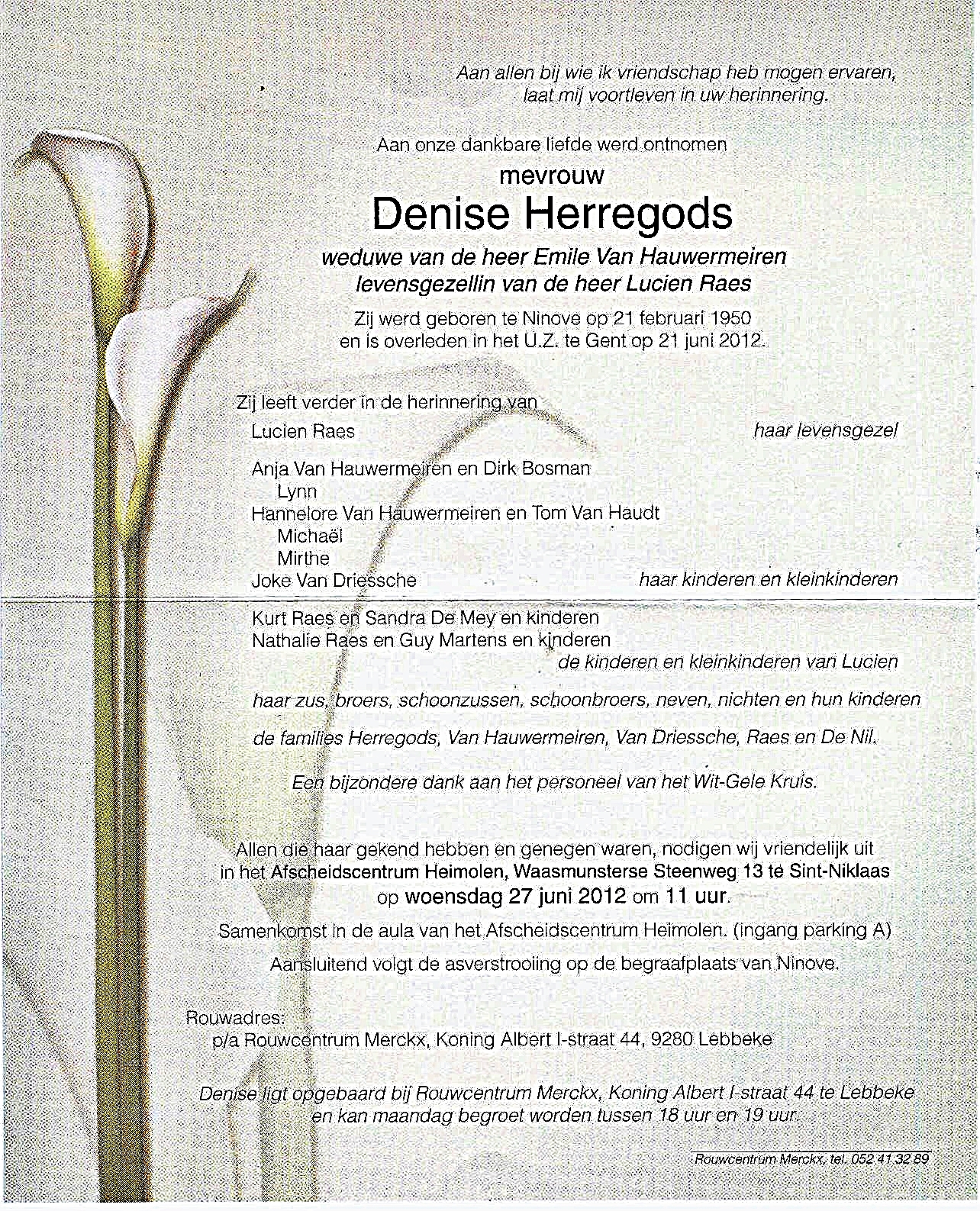 Denise Julienne Francoise Herregods Geboren: 21 februari 1950 — Ninove Overleden: 21 juni 2012 — Gent |