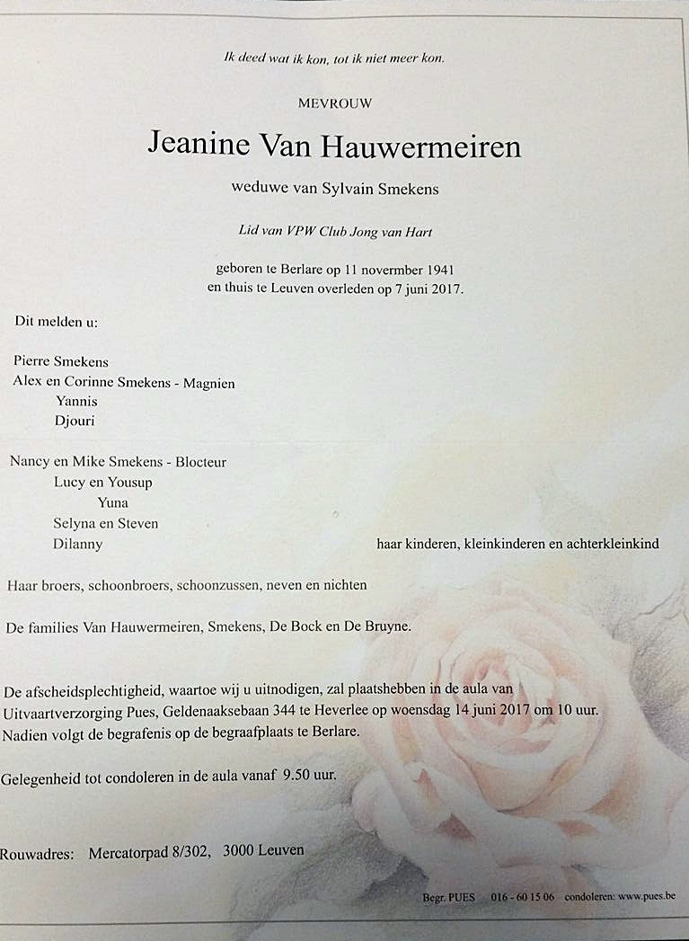 Jeanine Van Hauwermeiren Geboren: 11 november 1941 30 27 — Berlare Overleden: 7 juni 2017 — Leuven |