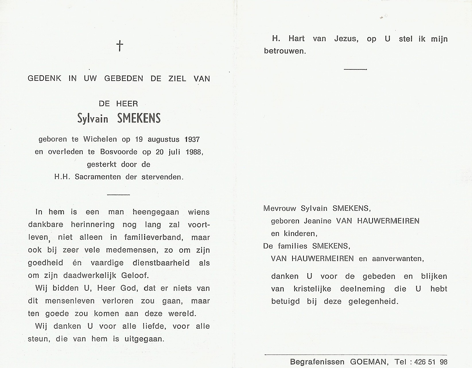 Sylvain Smekens Geboren: 19 augustus 1937 — Wichelen Overleden: 20 juli 1988 — Bosvoorde |
