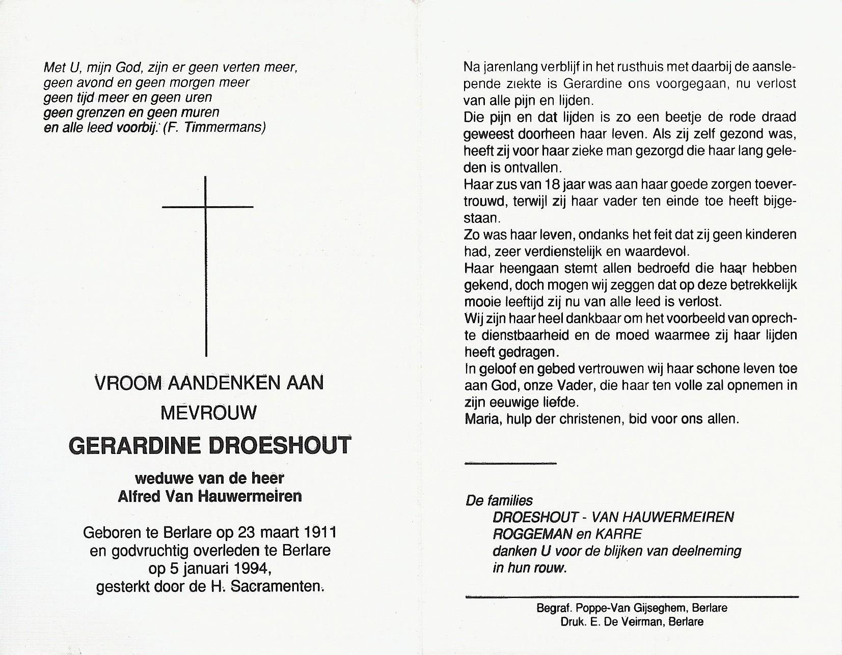 Geraldine Droeshout Geboren: 23 maart 1911 — Berlare Overleden: 5 januari 1994 — Berlare |