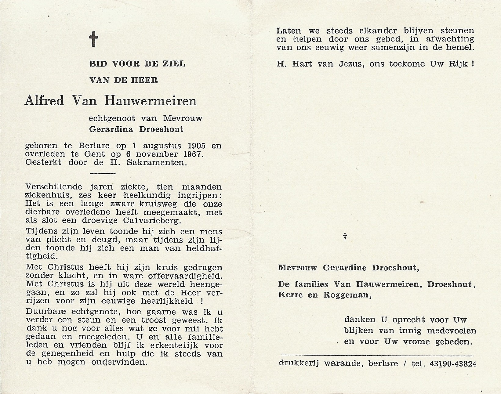 Alfred Van Hauwermeiren Geboren: 1 augustus 1905 28 22 — Berlare Overleden: 6 november 1967 — Berlare |