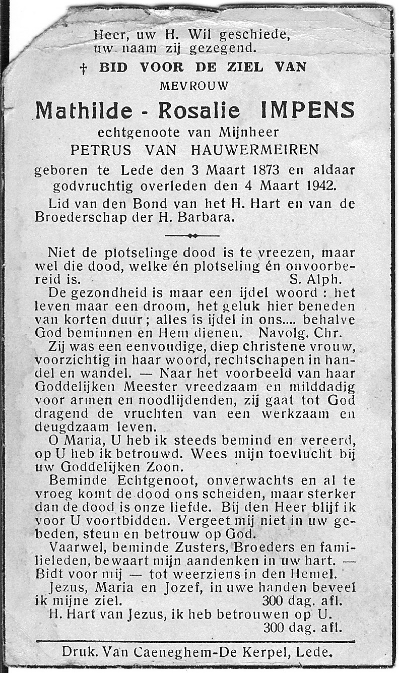 Mathilde-Rosalie Impens Geboren: 3 maart 1873 — Lede Overleden: 4 maart 1942 — Lede |