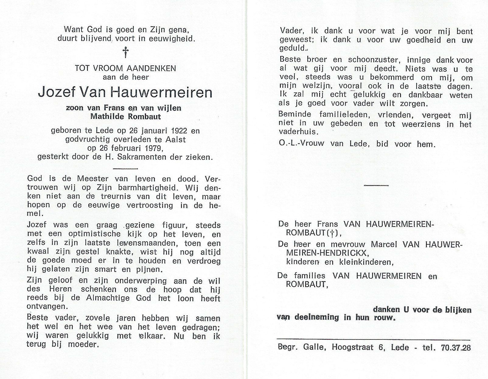 Jozef Van Hauwermeiren Geboren: 26 januari 1922 39 39 — Lede Overleden: 26 februari 1979 — Aalst |
